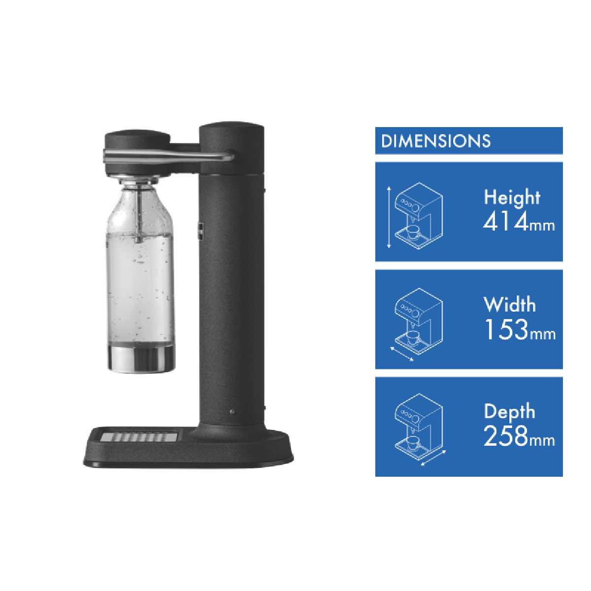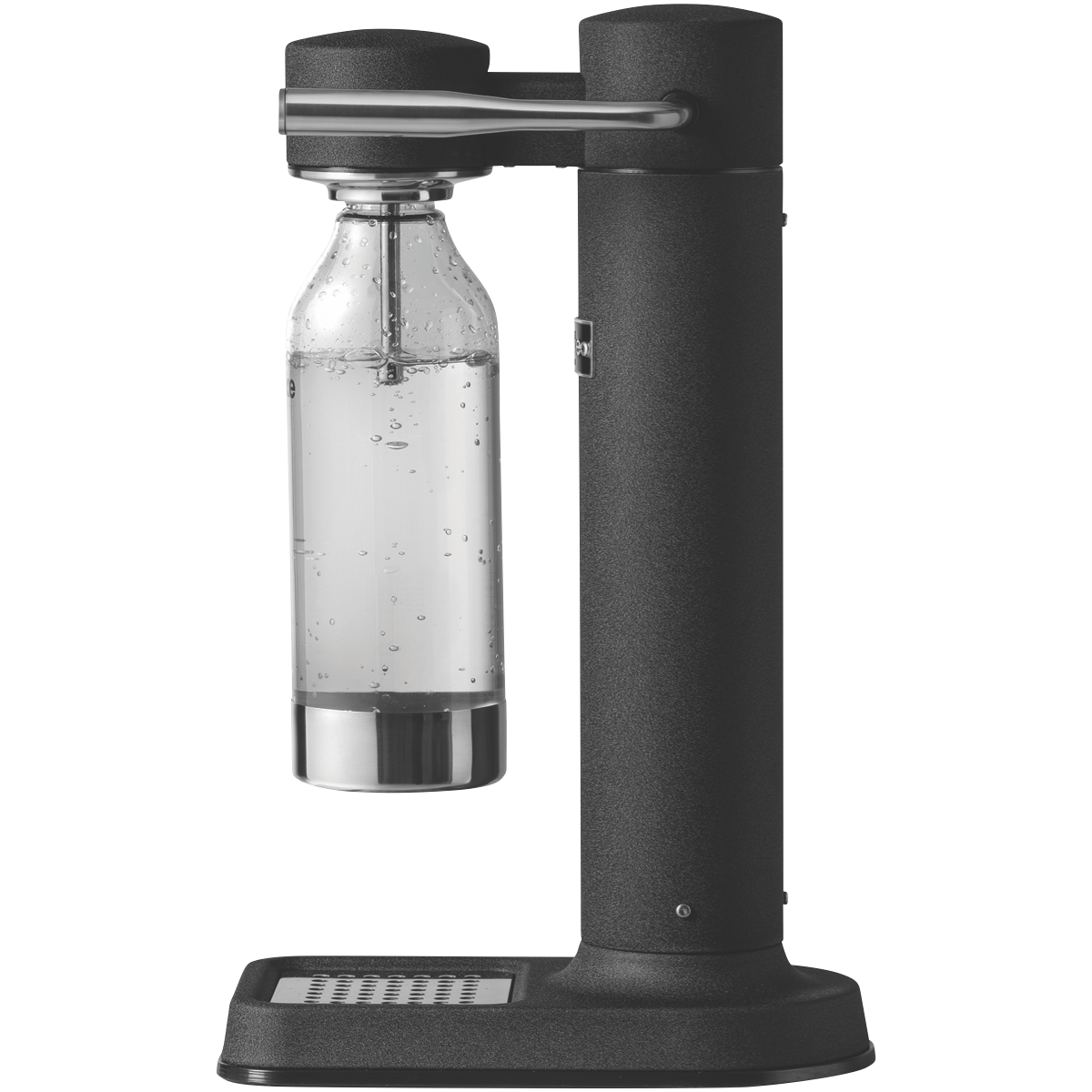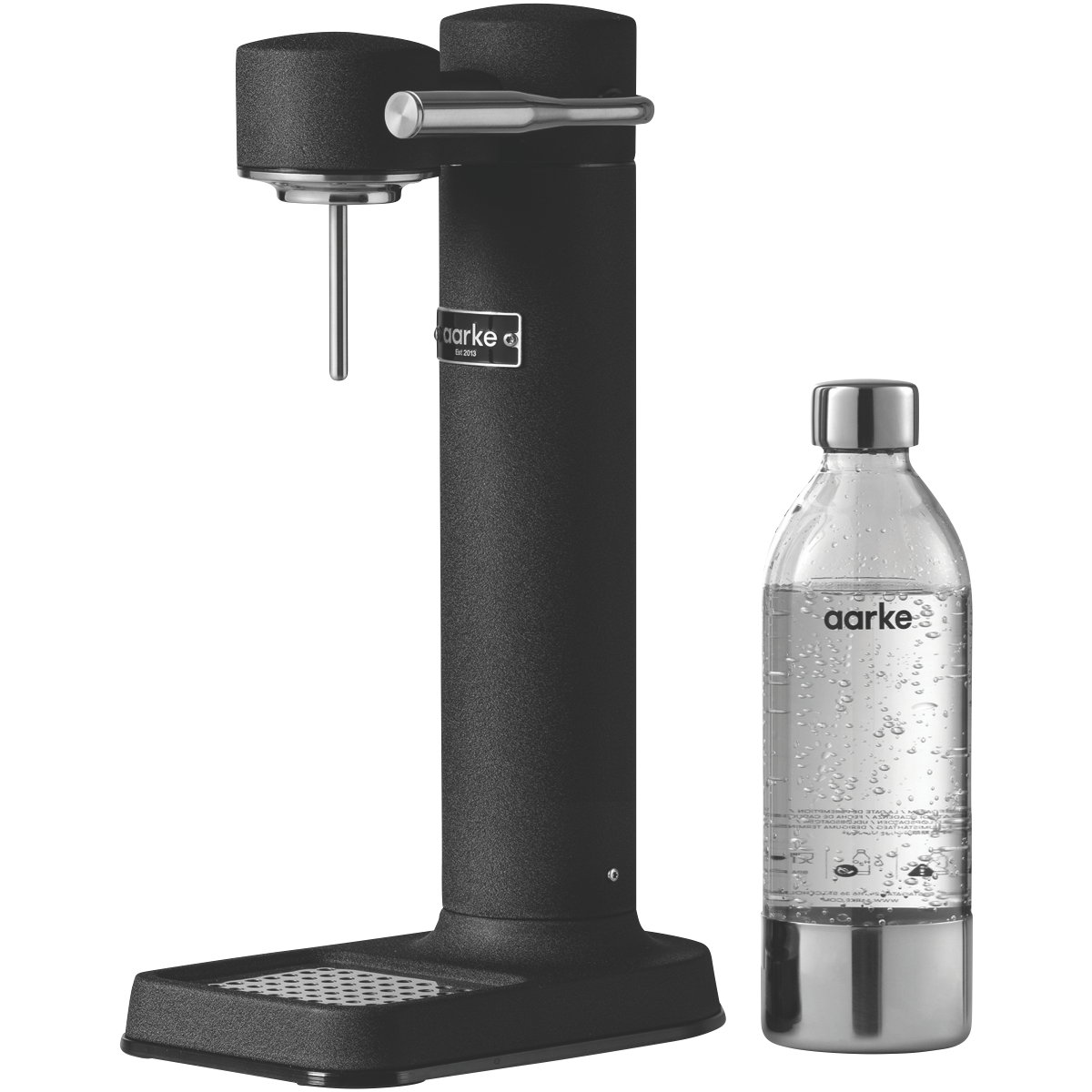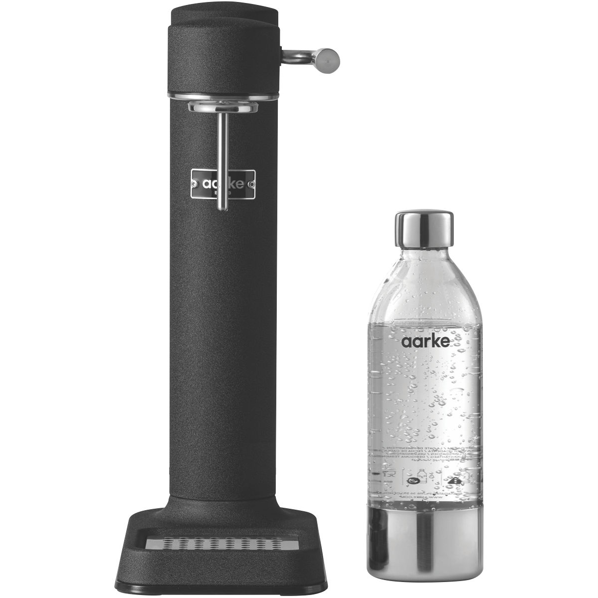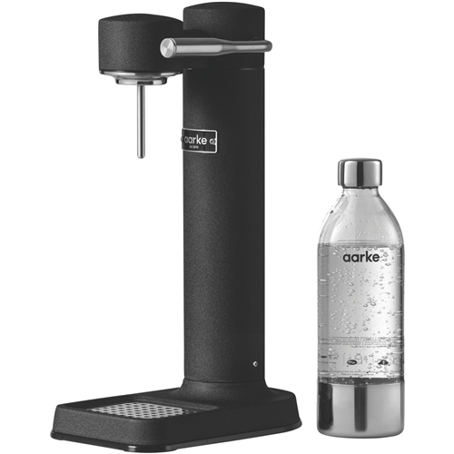Transform plain water into refreshing sparkling water with the sleek matte black aarke Carbonator 3. This cordless soda maker's stainless steel construction and smooth spray nozzle provide controlled carbonation every time. Simply fill the included BPA-free PET bottle to the fill line attach to the CNC machined nozzle and press the lever to carbonate water in seconds. The drip tray catches any overflow while the internal safety valve prevents over-carbonation accidents. This compact electricity-free appliance produces up to 27oz of bubbly water and fits perfectly on countertops in any modern kitchen. With no batteries or cables the Carbonator 3 allows you to make soda water anywhere. The premium matte black finish and stainless steel ensure this soda maker will retain its sophisticated style for years. Aarke provides a 2 year warranty so you can carbonate with confidence. The manufacturer's part number for this product is AK-A1018. Make the switch from store-bought carbonated drinks to healthier homemade soda with the aarke Carbonator 3.