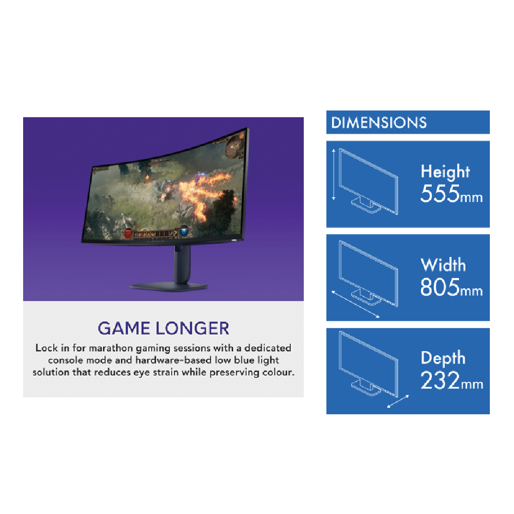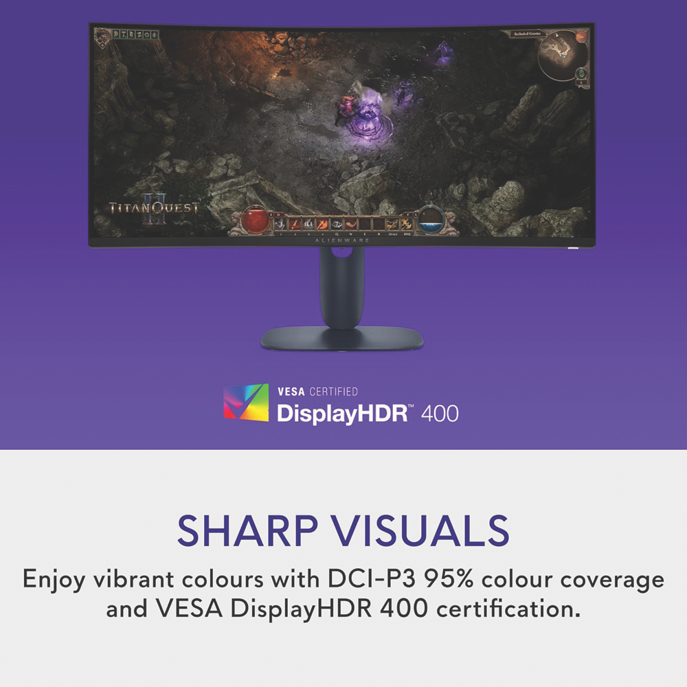 Take your gaming to new heights with this Alienware 34 curved monitor that wraps around your field of view. The WQHD resolution (3440 x 1440) delivers sharp detailed visuals across the ultrawide 21:9 aspect ratio display. With a lightning-fast 180Hz refresh rate and response times as quick as 1ms you'll experience incredibly smooth gameplay with minimal blur. The 400 nit brightness and 3000:1 contrast ratio ensure vivid colors and deep blacks while AMD FreeSync Premium and VESA AdaptiveSync prevent screen tearing. ComfortView Plus and Low Blue Light technology reduce eye strain during those marathon gaming sessions. Packed with connectivity options including HDMI DisplayPort and USB ports this monitor offers flexible adjustments for height tilt and pivot to find your perfect viewing angle. The AW3425DWM comes with a 3-year warranty for peace of mind.