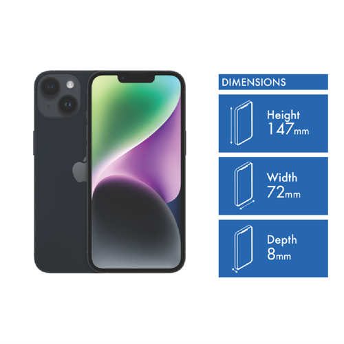 iPhone 14. With the most impressive dual-camera system on iPhone. Capture stunning photos in low light and bright light. Get peace of mind with a vital safety feature. 6.1-inch Super Retina XDR display(1). Advanced camera system for better photos in any light. Cinematic mode now in 4K Dolby Vision up to 30 fpsAction mode for smooth steady hand-held videos. A vital safety feature Crash Detection(2). All-day battery life and up to 20 hours of video playback(3) A15 Bionic chip with 5-core GPU for lightning-fast performance. Superfast 5G(4). Industry-leading durability features with Ceramic Shield and water resistance(5) iOS 16 offers even more ways to personalise communicate and share (6). Disclaimers: (1)The display has rounded corners. When measured as a standard rectangular shape the screen is 6.06 inches diagonally. Actual viewable area is less. (2) Emergency SOS uses a mobile network connection or Wi-Fi calling. (3) Battery life varies by use and configuration; see apple.com/au/batteries for more information. (4) Data plan required. 5G is available in selected markets and through selected carriers. Speeds vary based on site conditions and carrier. For details on 5G support contact your carrier and see apple.com/au/iphone/cellular. (5) iPhone 14 is splash water and dust resistant and was tested under controlled laboratory conditions with a rating of IP68 under IEC standard 60529 (maximum depth of 6 metres for up to 30 minutes). Splash water and dust resistance are not permanent conditions and resistance might decrease as a result of normal wear. Do not attempt to charge a wet iPhone; refer to the user guide for cleaning and drying instructions. Liquid damage is not covered under warranty but you might have rights under consumer law. (6) Some features may not be available in all countries or all areas.