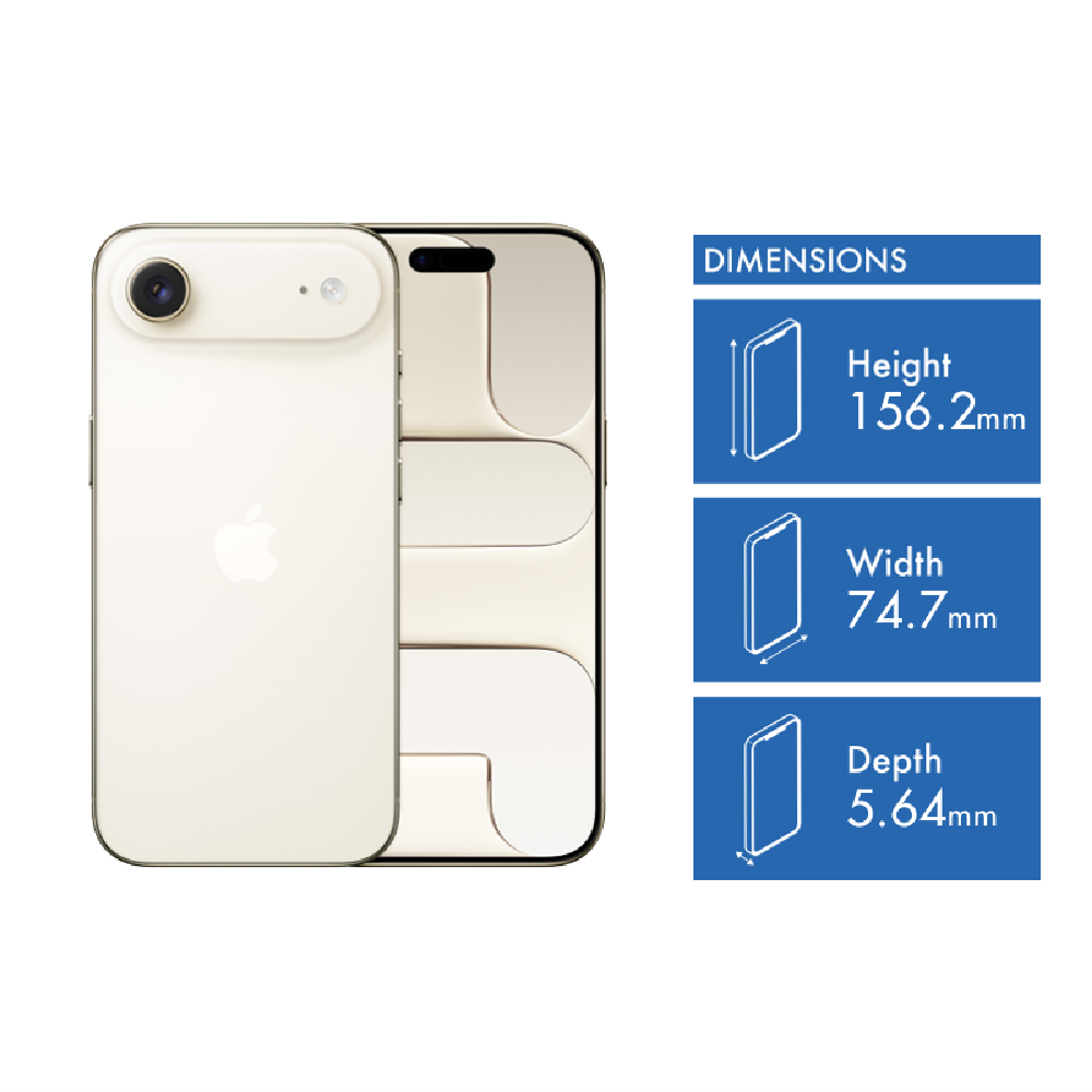 Introducing the Apple iPhone Air 256GB Light Gold MG2N4X/A. The thinnest iPhone ever. 6.5-inch display(1) durable Ceramic Shield front and back A19 Pro chip 48MP Fusion camera system and Center Stage front camera. The thinnest iPhone ever with the power of a pro chip inside. At 5.6 millimetres iPhone Air is so impossibly thin and light that it nearly disappears in your hand. Ultralight titanium frame. Ceramic Shield protects the back of iPhone Air making it 4x more resistant to cracks(2). And the new Ceramic Shield 2 on the front has 3x better scratch resistance(3). 48MP Fusion camera system with 2x optical-quality zoom. Effortlessly frame the perfect shot from where you are. Flexible ways to frame your shot. Smarter group selfies Dual Capture video for simultaneous front and rear recording and more. A19 Pro is the most efficient iPhone chip yet. Gives you pro performance in a breakthrough thin and light design. All-day battery life with up to 27 hours of video playback(4). A fresh design with Liquid Glass. Beautiful delightful and instantly familiar. With a more vibrant Lock Screen customisable backgrounds and polls in Messages Call Screening and more(5). Personal private powerful. Write express yourself and get things done effortlessly(6). If you don't have mobile reception or Wi-Fi iPhone can connect to a satellite so you can contact emergency services(7). And in a severe car crash iPhone can call for help when you can't(8). Stay connected at faster speeds with secure connections to Wi-Fi 7(9) 5G networks(10) and Bluetooth 6 plus eSIM(11). iPhone Air activates with an eSIM. With eSIM you enjoy greater flexibility enhanced convenience increased security and seamless connectivity especially when travelling internationally. A whole new level of privacy and security. Built in.