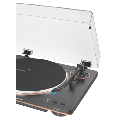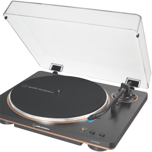 Bring your vinyl collection to life with the Audio Technica Bluetooth Turntable. This fully automatic belt-drive turntable lets you enjoy your favorite records at 33 1/3 or 45 RPM speeds. Want to stream music wirelessly? No problem it features Bluetooth 5.2 connectivity. The J-shaped tonearm minimizes tracking errors while the die-cast aluminum platter ensures stable rotation. You'll appreciate the high-quality AT-VM95C cartridge and stylus. With a sleek black and bronze finish this turntable looks as good as it sounds. Measuring 400 mm wide 330 mm deep and 110 mm high it fits nicely into your setup. The ATLP70XBTBZ comes with everything you need including a dust cover felt mat 45 RPM adapter RCA cable and AC adapter. Audio Technica covers it with a 1-year warranty for your peace of mind. Ready to rediscover your record collection?