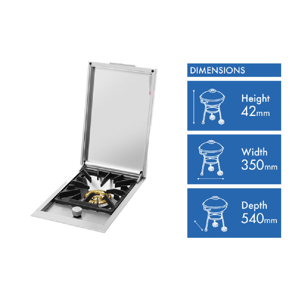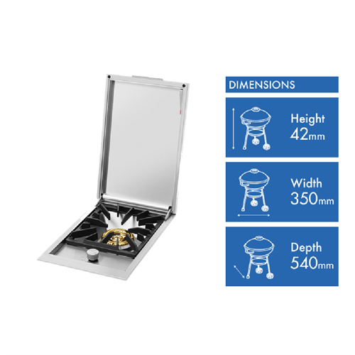 Add a versatile side burner to your outdoor kitchen with the BeefEater Integrated Side Burner. This built-in gas BBQ accessory comes with a handy lid and flame failure safety feature so you can cook sauces or side dishes while keeping your main grill free. Made from high-quality 304 grade stainless steel that stands up to outdoor conditions it fits perfectly into your countertop at just 42mm height 350mm width and 540mm depth. The package includes a gas conversion kit for flexible fuel options. Backed by a 2 year warranty this Signature ProLine addition (model BSW318SA) completes your outdoor cooking setup.