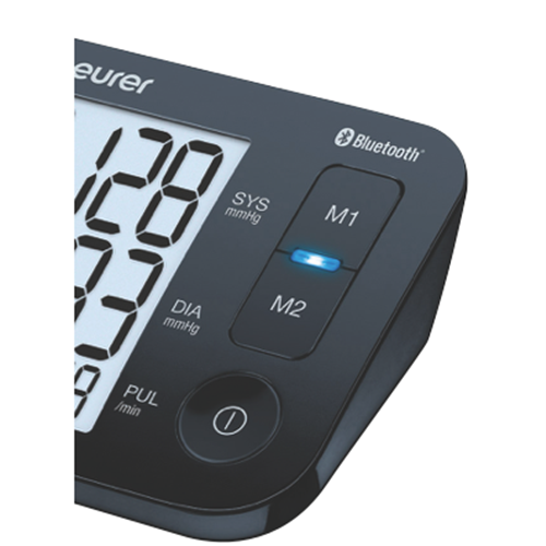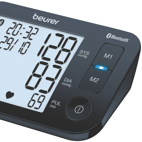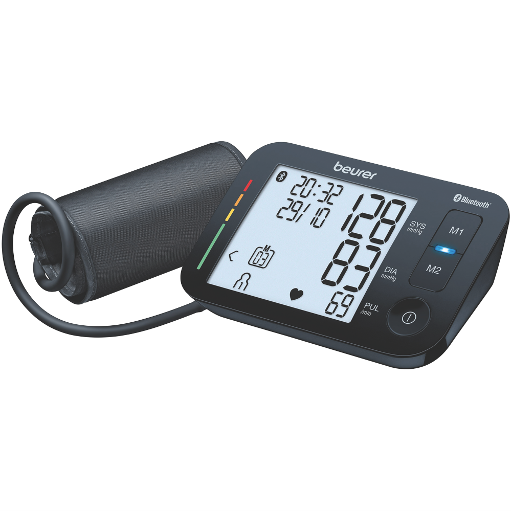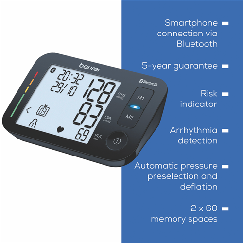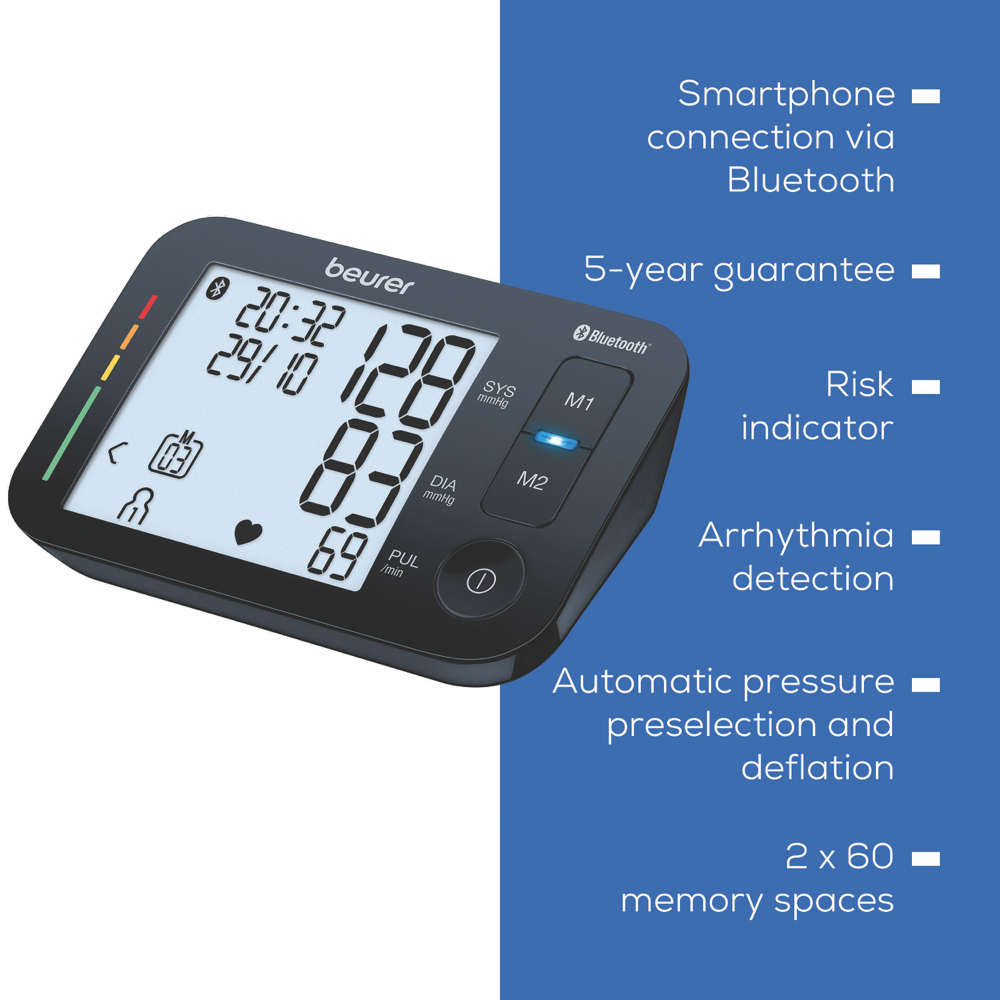Beurer's BM54 Bluetooth Upper Arm Blood Pressure Monitor makes it easy to keep tabs on your health. With its large easy-to-read XL display and fully automatic measurement checking your blood pressure is a breeze. The monitor stores 60 readings for each of two users so you can track your progress over time. Plus innovative Bluetooth technology lets you sync your data with the Beurer HealthManager Pro app on your smartphone. The BM54 even detects arrhythmia and comes with a handy storage bag. Cuff fits arms from 22-44 cm. 5-year manufacturer's warranty included.