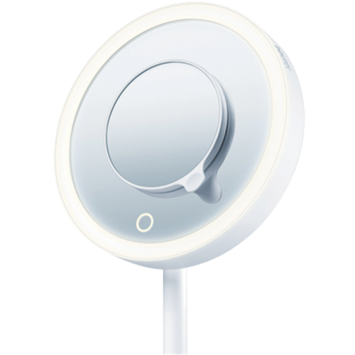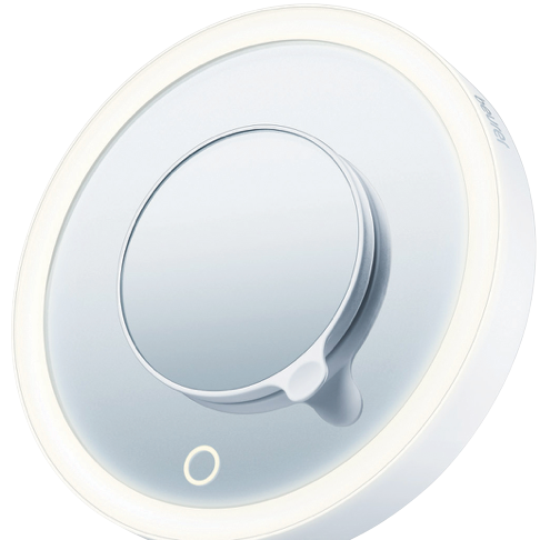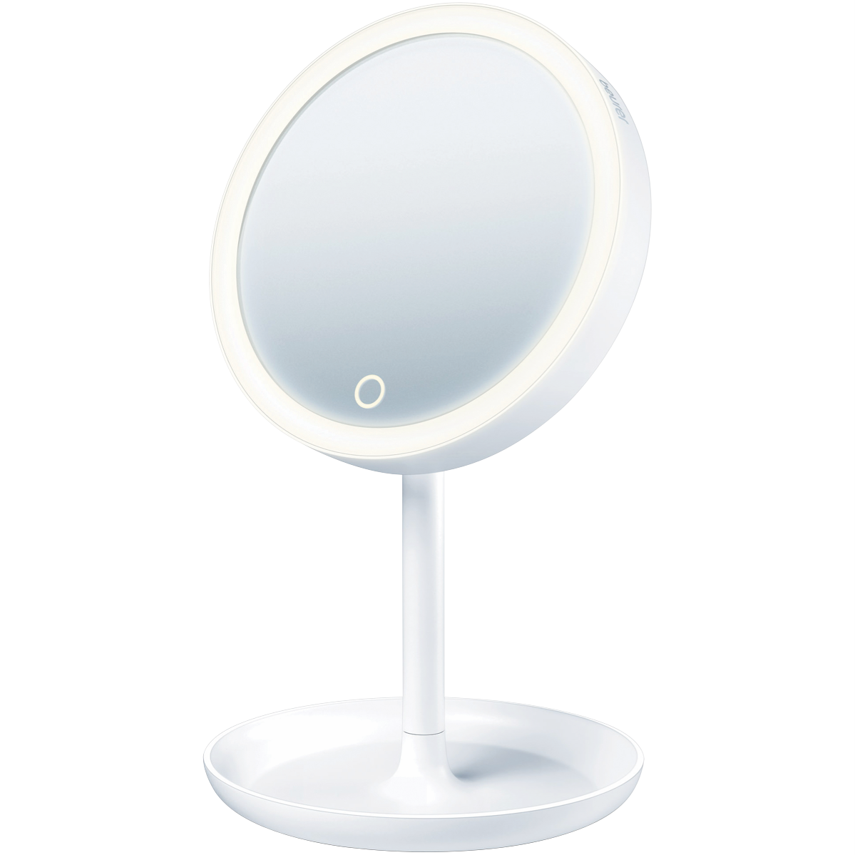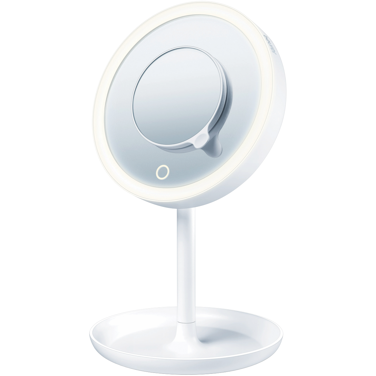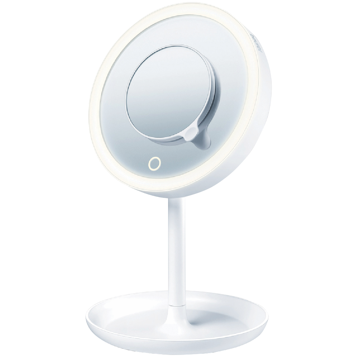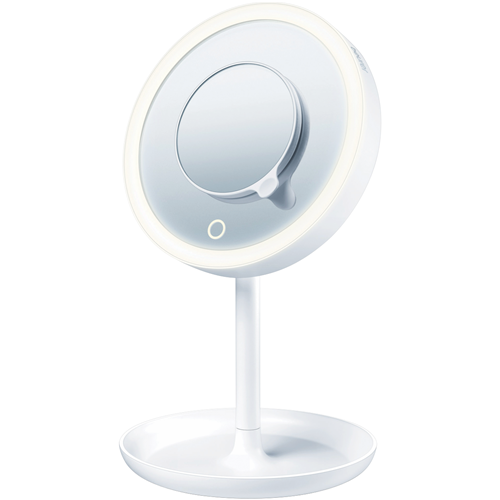 Light up your beauty routine with the Beurer Illuminated Cosmetic Mirror. This stylish white mirror features 28 bright energy-efficient LED bulbs that provide natural-looking illumination so you can apply your makeup with ease. The 360° rotating design allows you to position the mirror at the perfect angle while the convenient storage tray keeps beauty essentials organised. With a 5x magnifying inset mirror for precision tweezing or lash application this cosmetic mirror has everything you need to look your best. The manufacturer's part number for this product is BS45. Enhance your at-home beauty experience with the Beurer Illuminated Cosmetic Mirror today.