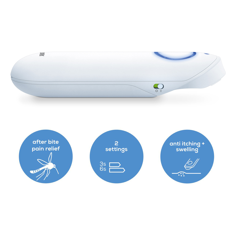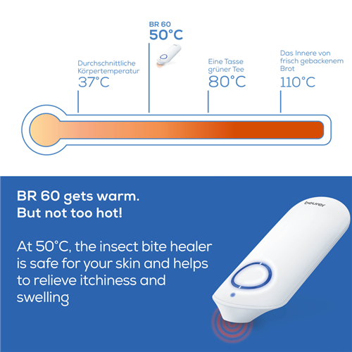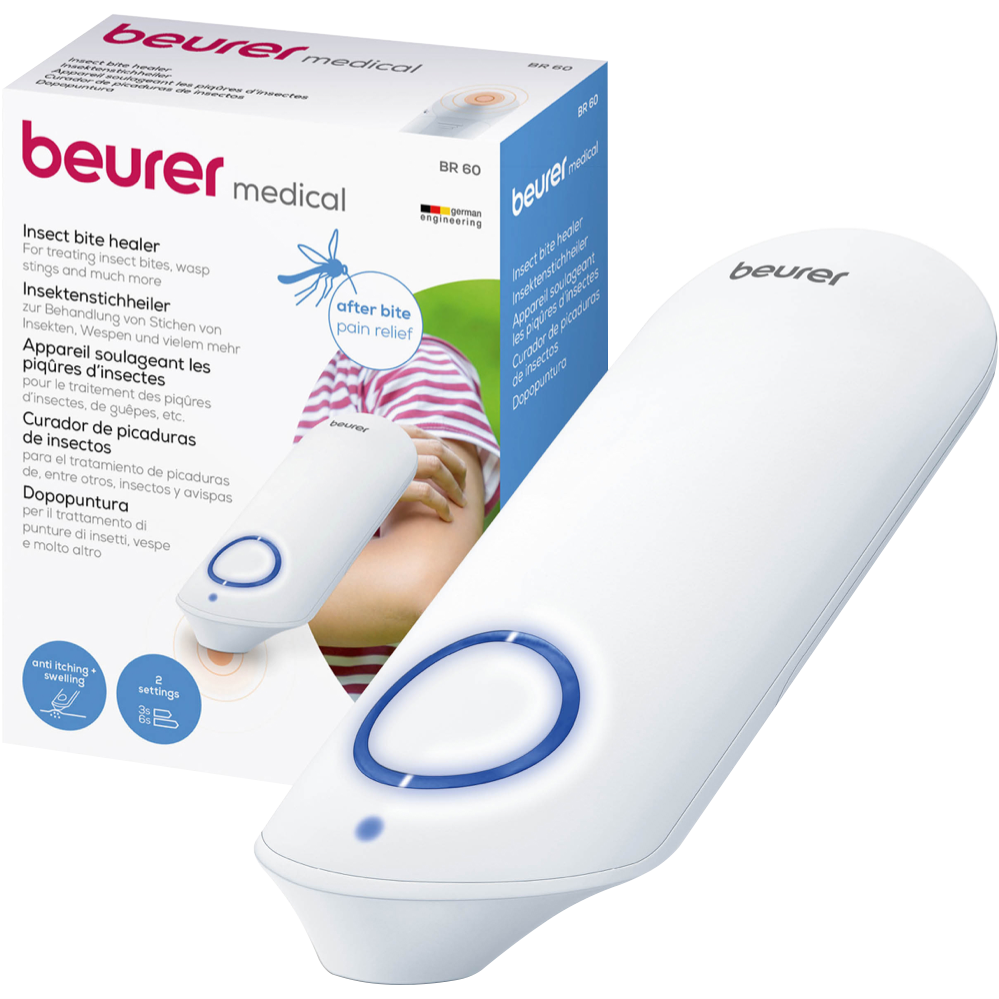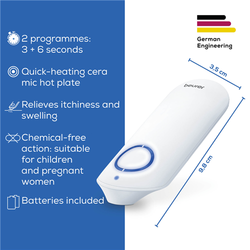 Itching Relief at your fingertips! The Beurer BR60 insect bite healer is suitable for treating insect bites and stings and helps prevent itching and swelling. With a quick warming ceramic plate the BR60 uses the application of targeted warmth to accelerate the healing process. Choose from 2 programs customised for use on either sensitive or regular skin. In a convenient portable size carry the BR60 with you wherever you go and achieve precise treatment for those painful and irritating insect bites and stings. As the bite pen does not contain any chemicals it is suitable for pregnant women and children aged 3+ when accompanied by an adult. Slip it into your bag your car your pocket and always be ready for instant relief. 5 Year Warranty. German Design and Engineering.