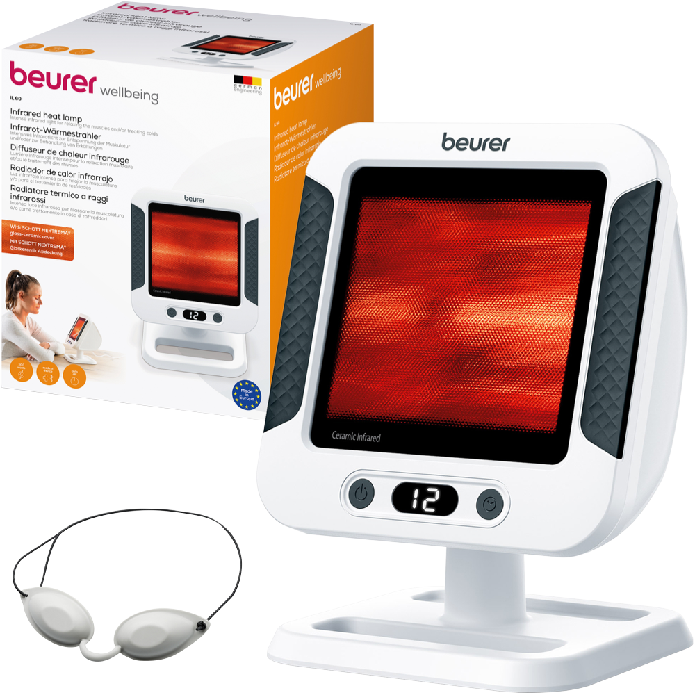 The Beurer IL60 XL infrared heat lamp is ideal for providing soothing relief for colds and muscle tension joint pain regeneration and general wellbeing. The IL60 has a continuously adjustable shade up to 40 degrees to allow for angling and adjustment toward the affected area a timer with automatic switch-off and an individually adjustable treatment time. Made in Europe with the unique SCHOTT NEXTREMA® XL glass-ceramic cover lens the IL 60 XL Infrared Lamp is suitable for particularly challenging applications. With intensive power up to 300 watts additional built in safety features include an automatic switch-off function once the set time has elapsed built-in overheating protection active ventilation and a UV blocker. Includes protective eyewear to keep eyes safe during use. 3 year warranty. Designed & Engineered in Germany.