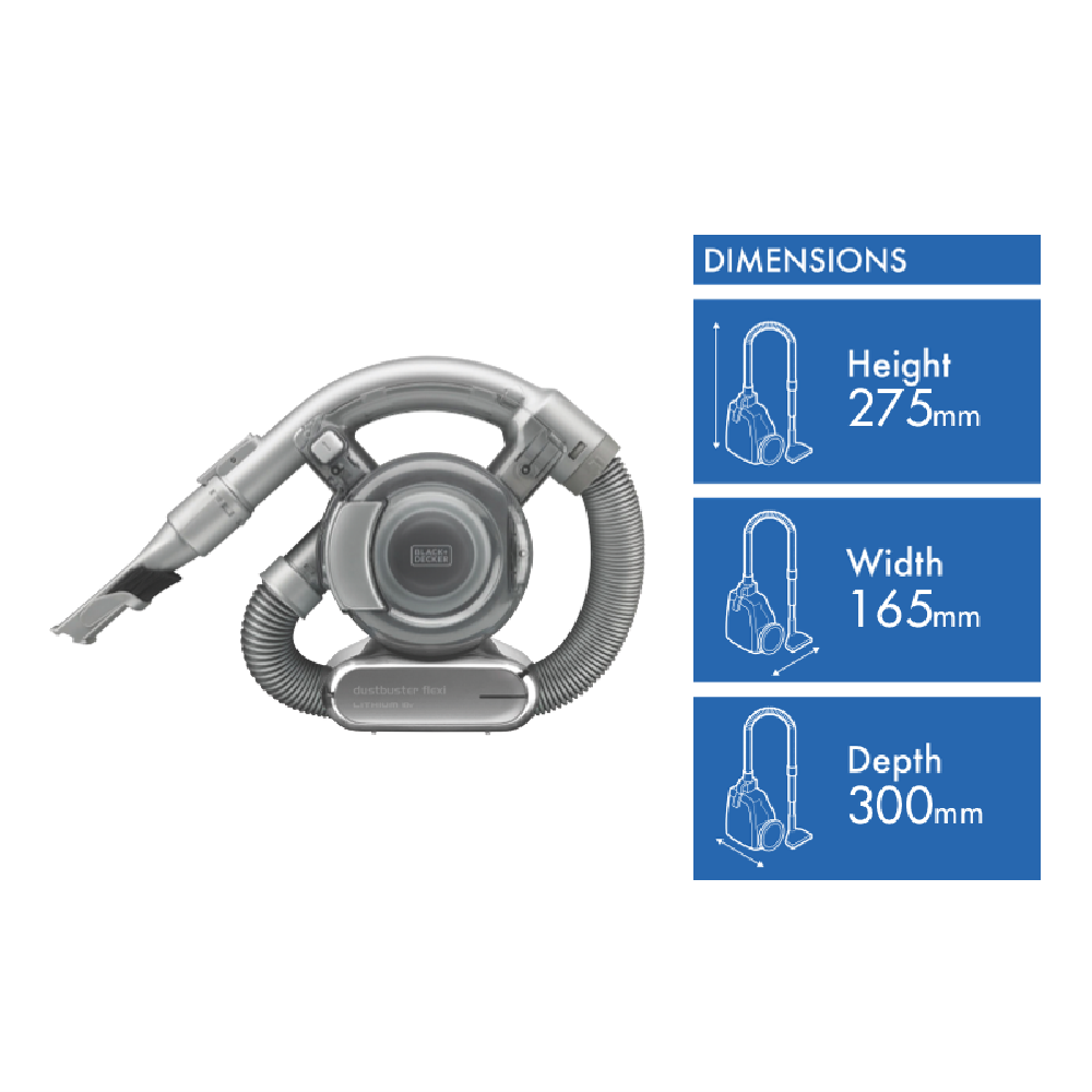 Tackle dust and dirt with the BLACK & DECKER Dusbuster 18.0V Flexi Handheld Vacuum. This powerful lightweight handheld vacuum features lithium-ion battery technology and includes a long crevice tool short crevice tool and soft brush so you can clean even hard to reach areas. The 18V battery provides strong suction to lift dust and debris from carpets furniture and even your car. At just 1.35kg it's easy to maneuver into tight spaces like stairs or under furniture. With up to 15 minutes of fade-free power you can quickly clean up messes in your home or car. The 4 hour charge time ensures the Dusbuster is always ready when you need it. Backed by BLACK+DECKER's 2 year warranty the Dusbuster Handheld Vacuum makes cleaning fast and convenient. The manufacturer's part number for this product is PD1820L. Shop now and enjoy the freedom of cordless portable cleaning power.