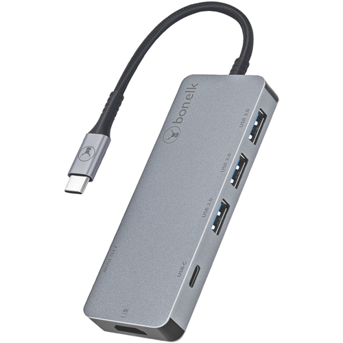 Streamline your connectivity and boost productivity with the Bonelk Long-Life USB-C to 6 in 1 Multiport Hub. This versatile hub enhances your workflow by expanding a single USB-C port into a 4K HDMI port a USB 3.1 port three USB 3.0 ports and a USB-C charging port. View presentations or movies in stunning 4K resolution on an external monitor transfer data rapidly via the USB 3.0 ports and keep your laptop charged - all through one compact hub. The plug-and-play design ensures seamless setup while the durable construction provides reliable performance. With the ability to connect multiple peripherals through a single port this Bonelk hub maximizes productivity. Experience smooth 4K video swift file transfers and convenient charging reducing cable clutter. The manufacturer's part number for this product is ELK-80030-R. Transform your connectivity with the Bonelk USB-C Multiport Hub today.