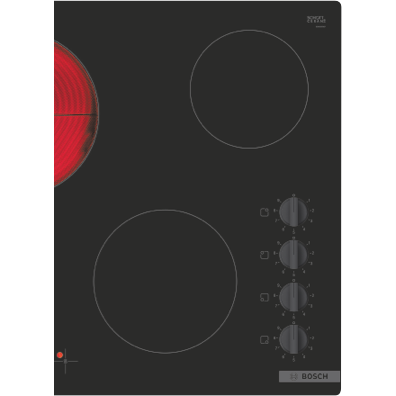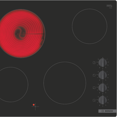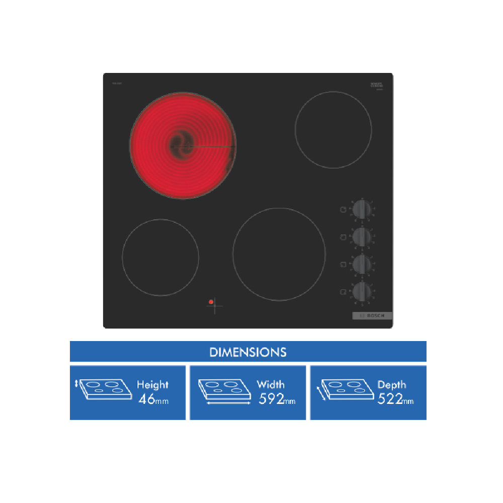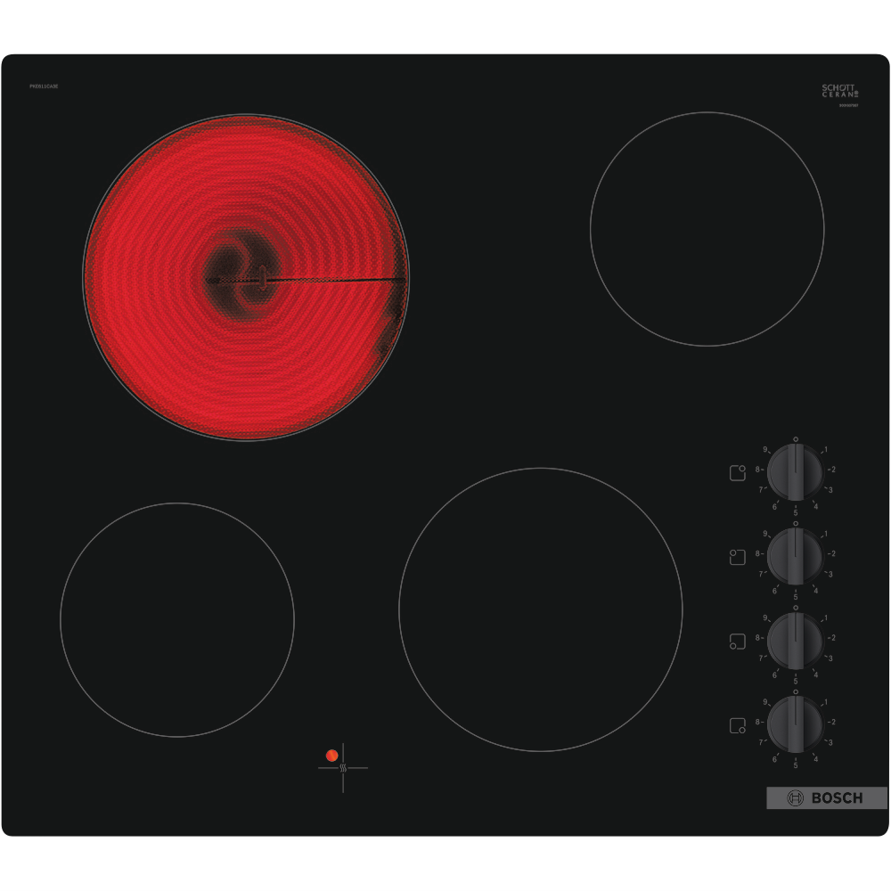 Step up your cooking game with the sleek 60cm Bosch Ceramic Cooktop. This electric cooktop boasts 4 cooking zones with 9 adjustable power levels providing exceptional flexibility and control for all your culinary creations. The intuitive sword knobs and residual heat indicators allow for safe precise cooking every time. With a width of 592mm height of 46mm and depth of 522mm this cooktop delivers ample room to cook for the whole family. The durable ceramic glass surface not only looks fantastic but makes cleaning a breeze. Enjoy peace of mind with Bosch's 2 year warranty. Sear sauté and simmer away on this versatile cooktop that makes cooking a pleasure. The manufacturer's part number for this product is PKE611CA2A. Discover how this cooktop can make your kitchen complete.