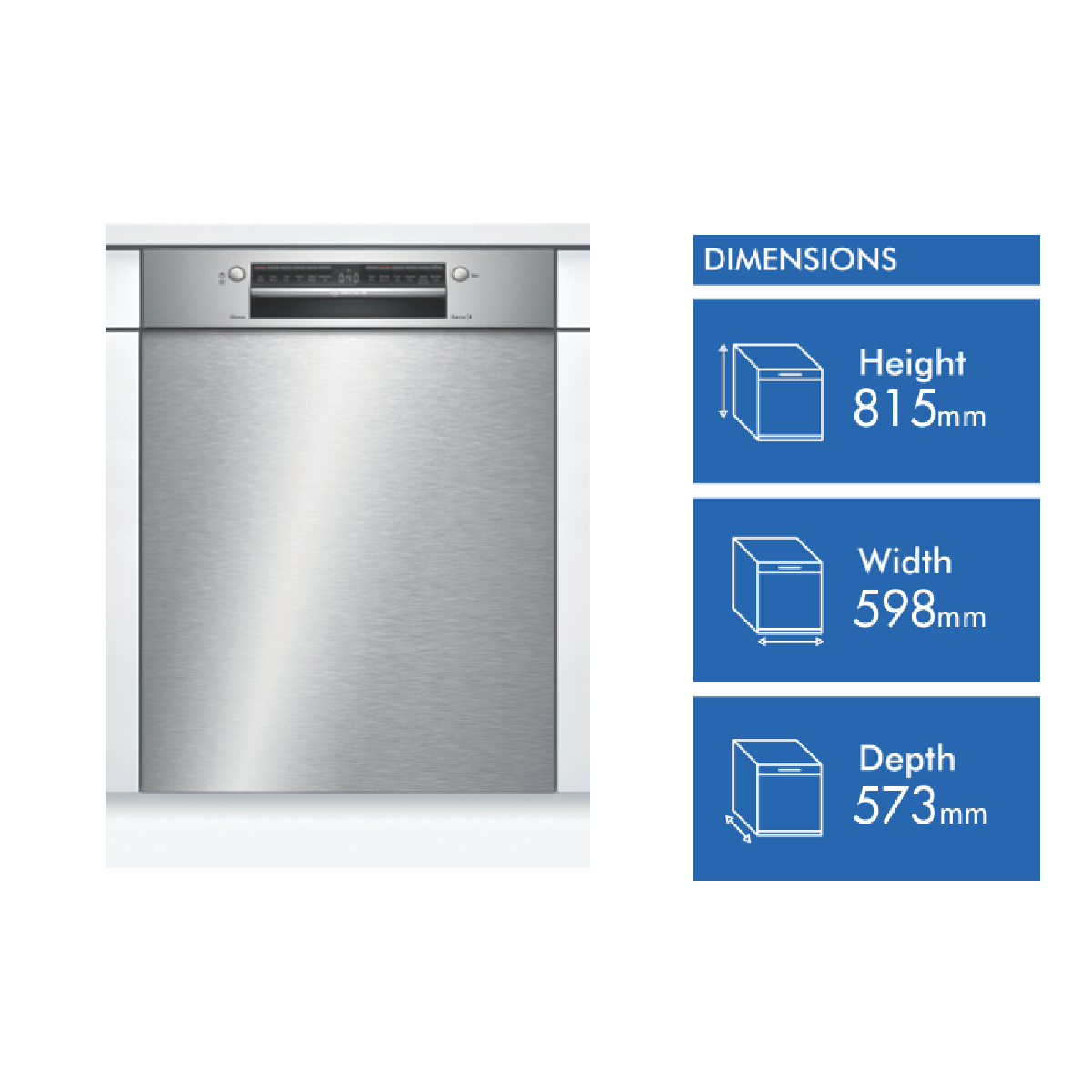 Discover flexible loading solutions and convenient remote operation via an app with this Wi-Fi connected Bosch Series 4 60cm Under Bench Dishwasher Stainless Steel SMU4HTS01A. A 14-place setting holds plenty of plates bowls cups and serving dishes in various sizes thanks to the upper RackmatickPlus basket that can be height adjusted in three ways to make it fit and VarioFlex red touchpoints that easily let you know which plate racks in the upper or lower baskets can be folded to accommodate them. This Bosch dishwasher utilises 13.5 litres per wash on the Eco program with a cold-water connection. It has a 4 Star Energy Rating and a 4 Star WELS Water Rating WELS Licence Number D02579. Select the Glass wash program for a lower temperature clean of your favourite crystal glassware or fine china or the sensor-controlled Auto Wash program which automatically selects the settings based on the level of soiling. Reduce wash time with the SpeedPerfect option select Extra Dry for additional drying or HygienePlus for an increased final rinse temperature for a perfectly sanitised result. With the Bosch Home Connect app on your smartphone review the Easy Start best program recommendations based on your input on the type of dishes and cleaning preference option selected view the estimated water and energy consumption of each program or adjust a wash option even after the program has started.