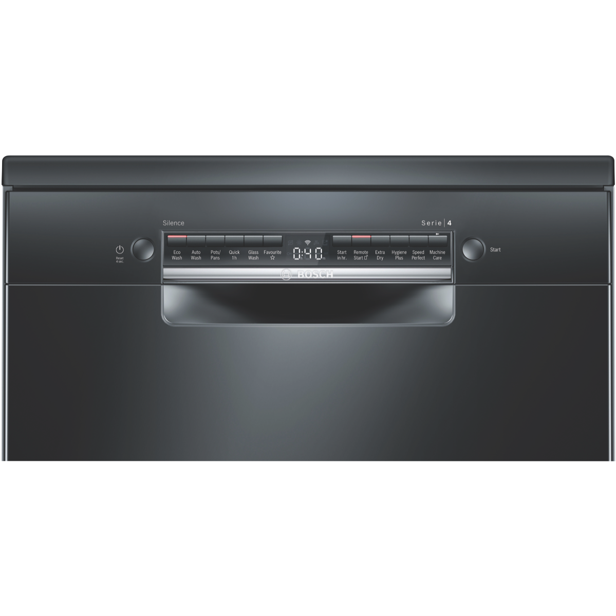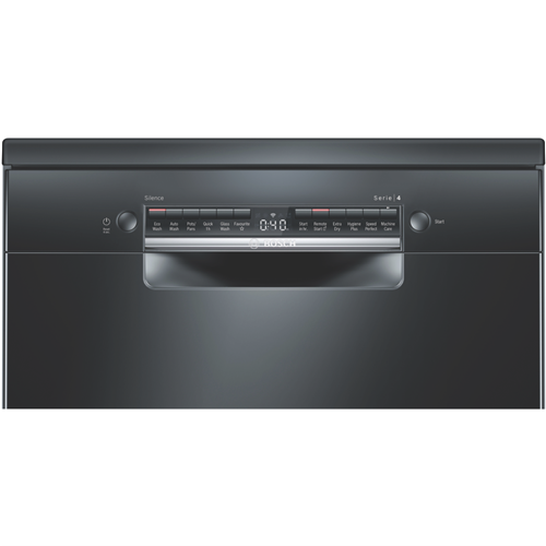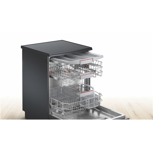 Discover plenty of loading flexibility excellent cleaning results with efficient use of resources and incredible convenience to your everyday with the management of settings via an app with this Bosch Series 4 60cm Freestanding Dishwasher Black Inox SMS4HVB01A with Wi-Fi connectivity. A 14-place setting holds plenty of plates bowls cups and serving dishes in various sizes thanks to the upper RackmatickPlus basket that can be height adjusted in three ways to make it fit and VarioFlex red touchpoints that easily let you know which plate racks in the upper or lower baskets can be folded to accommodate them. This Bosch dishwasher utilises 13.5 litres per wash on the Eco program with a cold-water connection. It has a 4 Star Energy Rating and a 4 Star WELS Water Rating WELS Licence Number D02592. Select one of six programs like 'Glass Wash' for a lower temperature clean of your favourite crystal glassware or fine china or the sensor-controlled 'Auto Wash' program which automatically selects the settings based on the level of soiling. Reduce wash time with the SpeedPerfect option select Extra Dry for additional drying or HygienePlus for an increased final rinse temperature for an extended time. With the Bosch Home Connect app on your smartphone review the Easy Start best program recommendations based on your input on the type of dishes and cleaning preference option selected view the estimated water and energy consumption of each program or adjust a wash option even after the program has started.