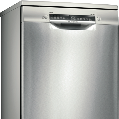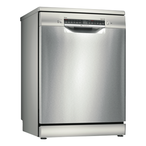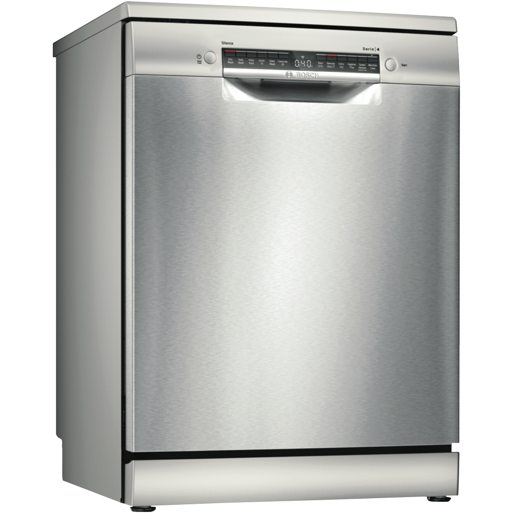 Discover plenty of loading flexibility excellent cleaning results with efficient use of resources plus Wi-Fi connectivity for management of settings via an app for convenience like never before with the Bosch Series 4 60cm Freestanding Dishwasher Stainless Steel SMS4HVI01A. A 14-place setting holds plenty of plates bowls cups and serving dishes in various sizes thanks to the upper RackmatickPlus basket that can be height adjusted in three ways to make it fit and VarioFlex red touchpoints that easily let you know which plate racks in the upper or lower baskets can be folded to accommodate them. This Bosch dishwasher utilises 13.5 litres per wash on the Eco program with a cold-water connection. It has a 4 Star Energy Rating and a 4 Star WELS Water Rating WELS Licence Number D02593. Select the Glass wash program for a lower temperature clean of your favourite crystal glassware or fine china or the sensor-controlled Auto Wash program which automatically selects the settings based on the level of soiling. Reduce wash time with the SpeedPerfect option select Extra Dry for additional drying or HygienePlus for an increased final rinse temperature for an extended time. With the Bosch Home Connect app on your smartphone review the Easy Start best program recommendations based on your input on the type of dishes and cleaning preference option selected view the estimated water and energy consumption of each program or adjust a wash option even after the program has started - speed up program time by up to 50% or activate silence mode.