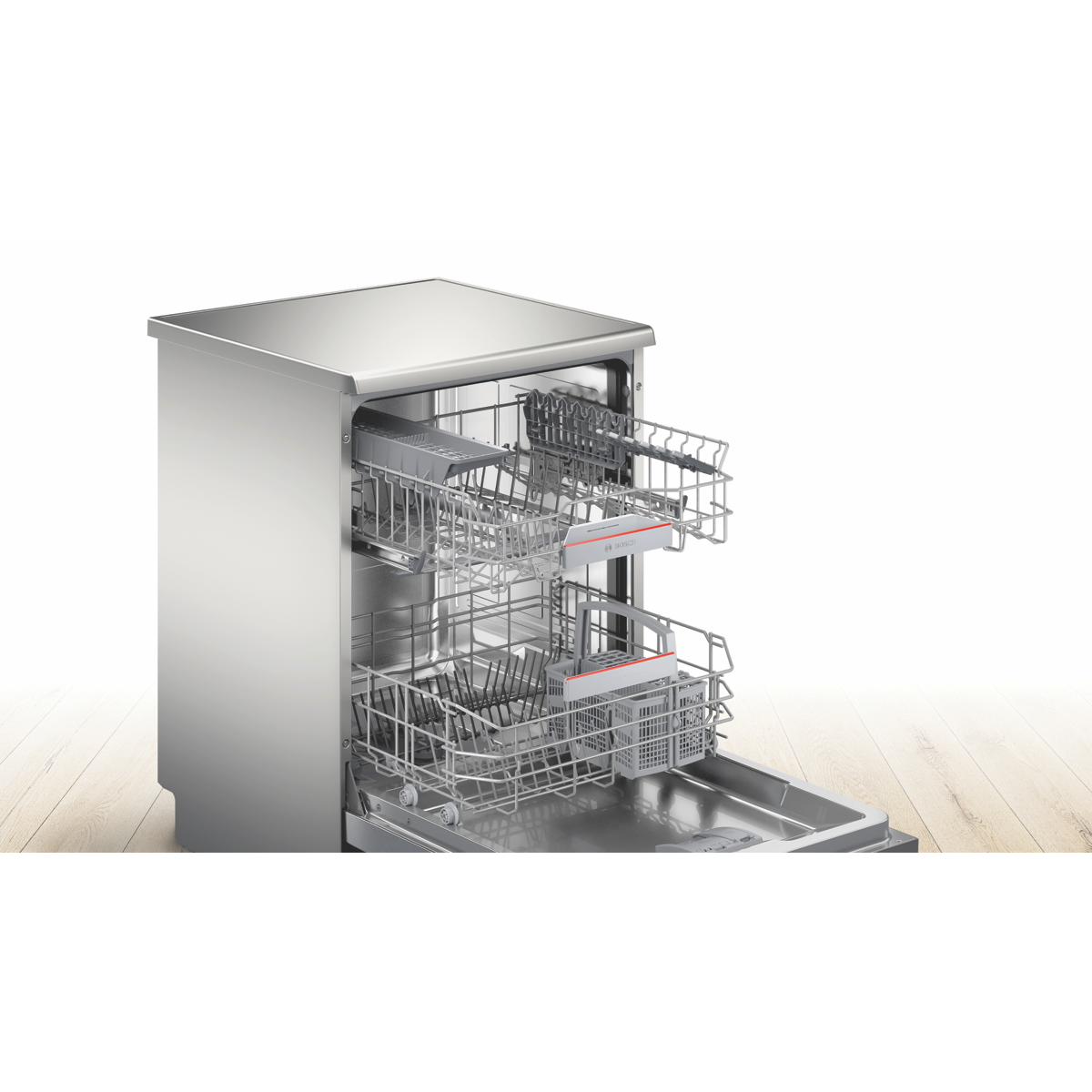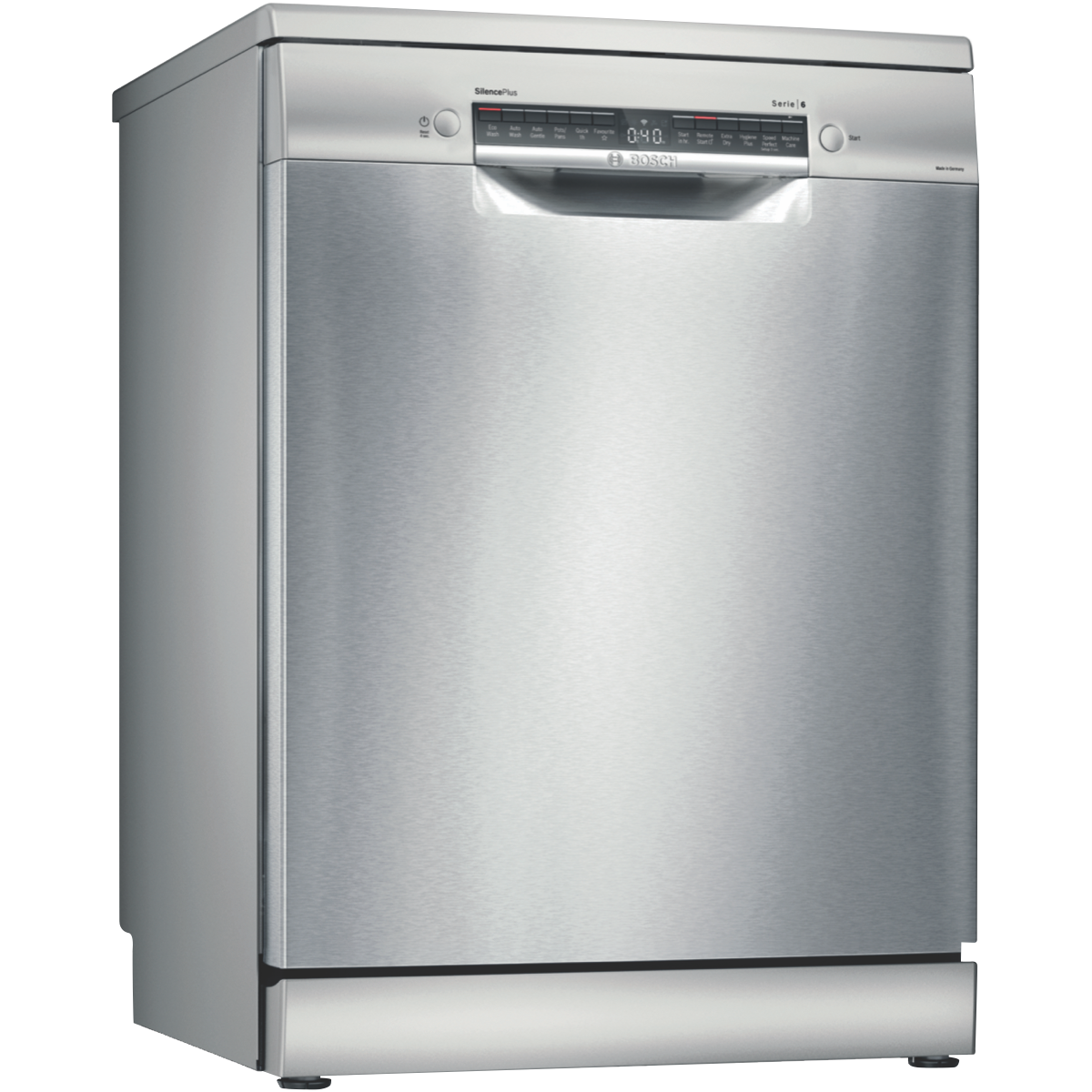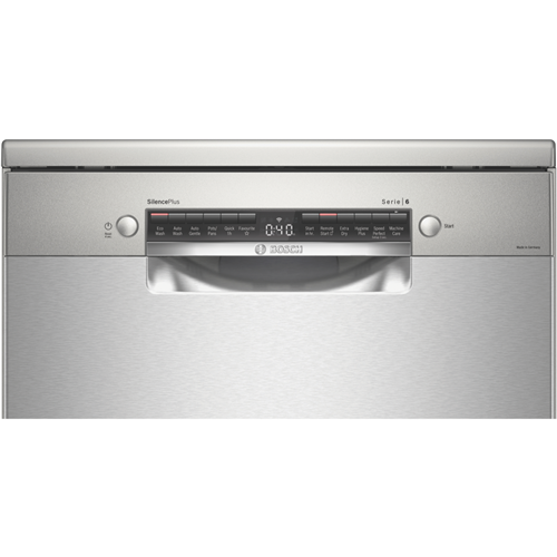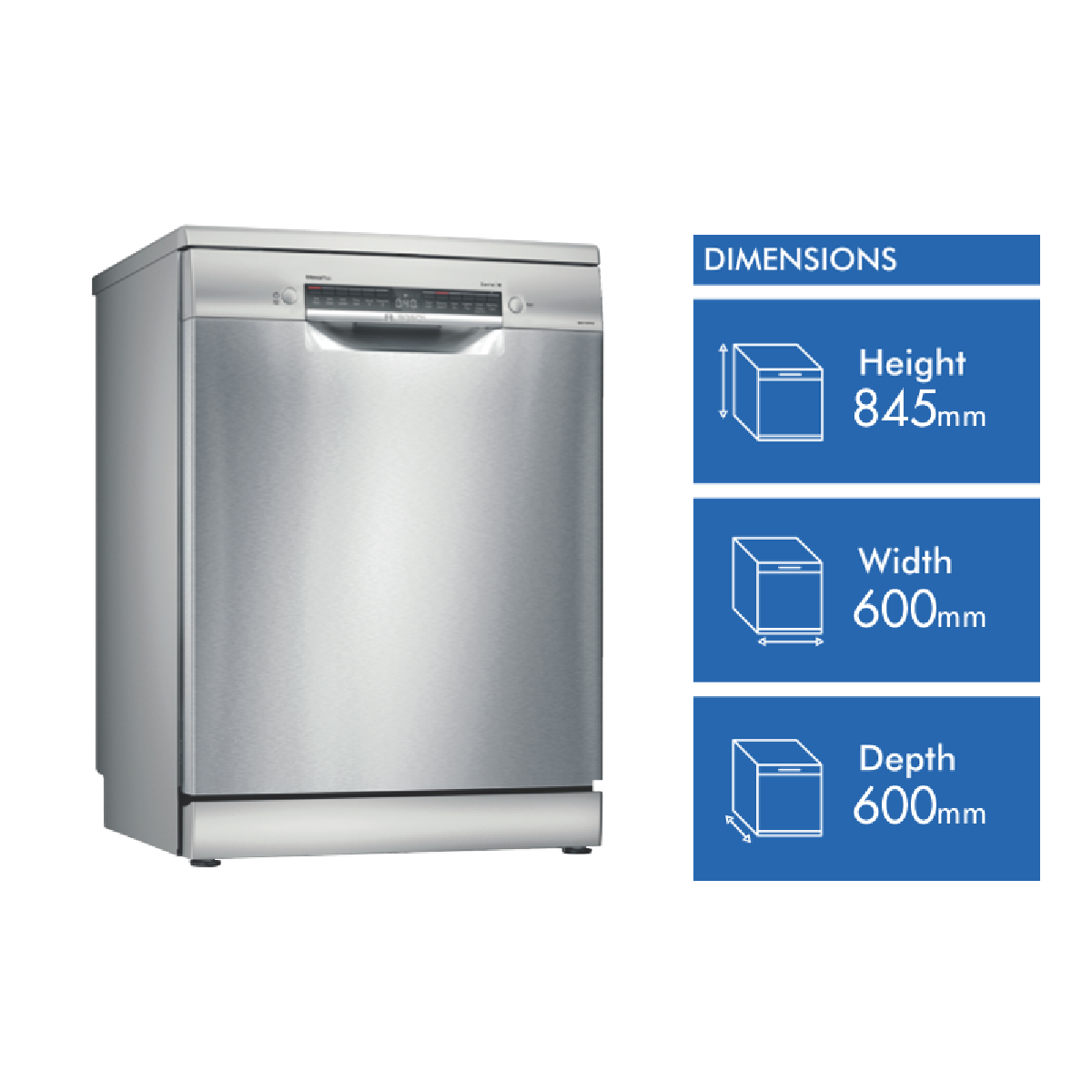 Bring the power of Bosch engineering into your kitchen with this sleek freestanding stainless steel dishwasher. With 14 place settings and 6 wash programs including Eco Wash this energy-efficient dishwasher makes quick work of post-dinner cleanup. The adjustable RackMatic system fits your plates and pans perfectly while the near-silent 44 decibel operation lets you run a cycle any time. Home Connect allows you to control and monitor your dishwasher remotely. With a 4 star energy rating and 5 star WELS water rating this dishwasher saves resources and money. The AquaStop Plus system prevents leaks and the self-cleaning filter needs less maintenance. Make your kitchen complete with this durable high-quality Bosch dishwasher. The manufacturer's part number for this product is SMS6HAI02A.
