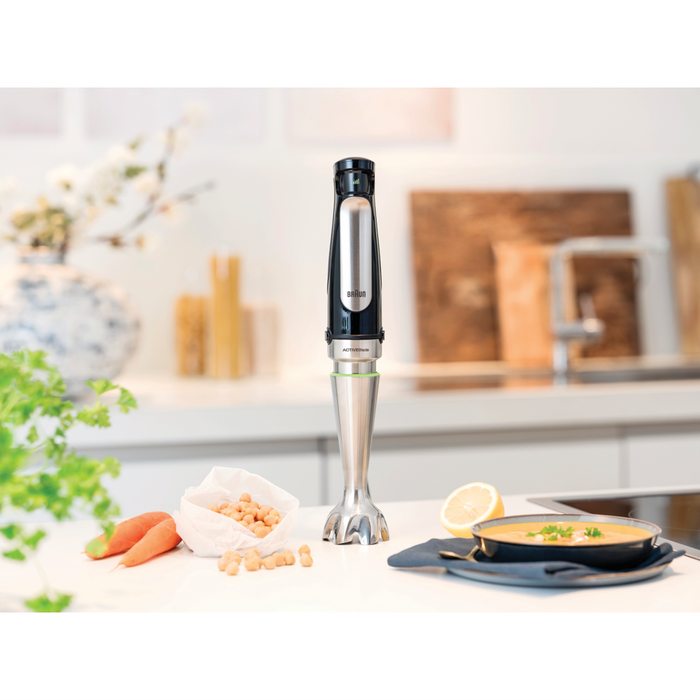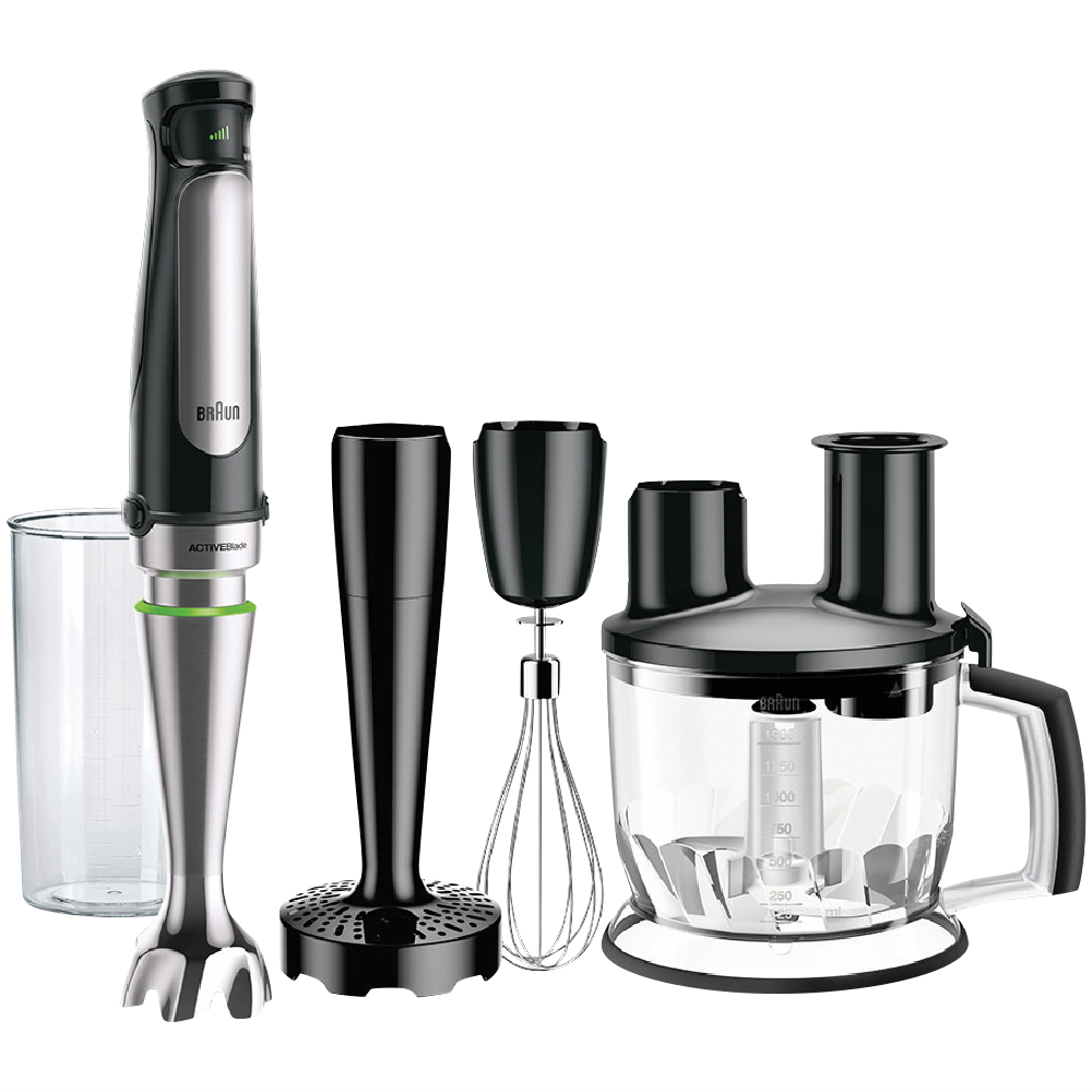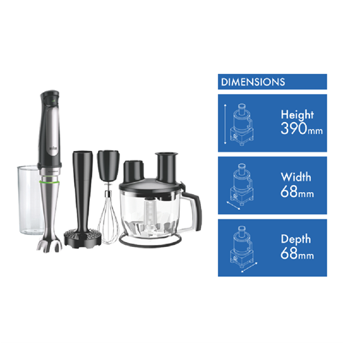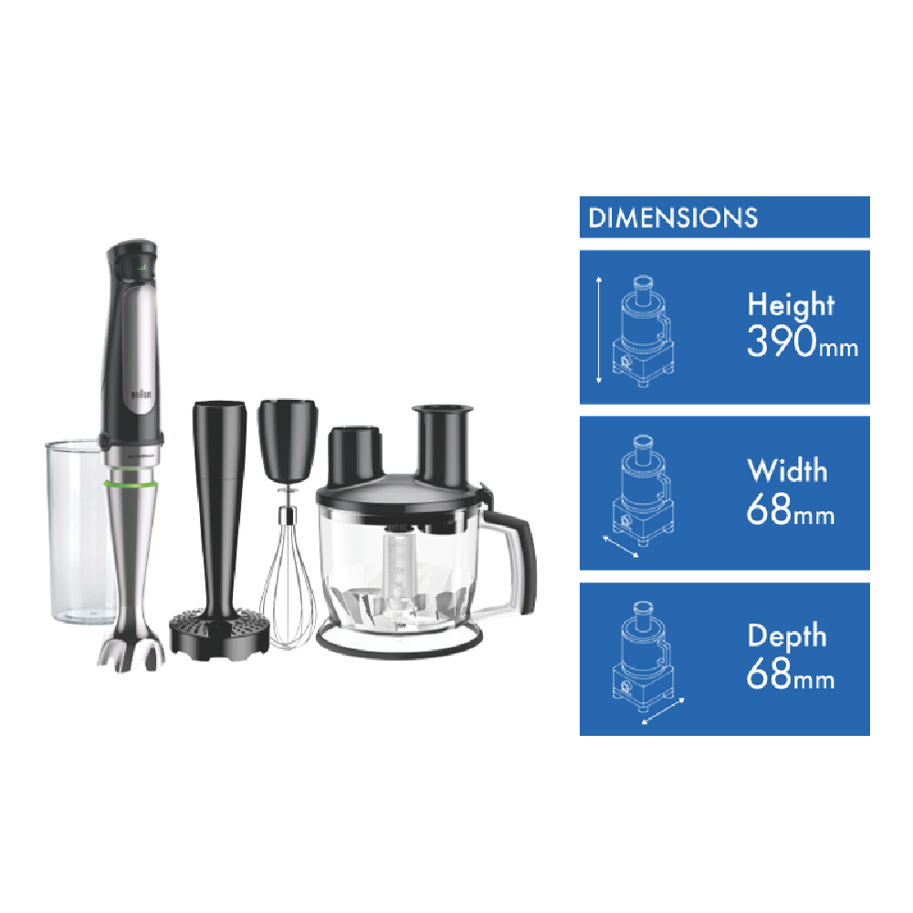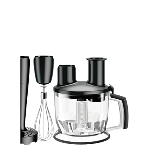 Transform your kitchen into a gourmet wonderland with the Braun MultiQuick 7 Gourmet Hand Blender. This powerful 1000-watt blender makes quick work of food prep with its SmartSpeed technology and stainless steel blades. The EasyClick system allows you to switch between accessories faster for non-stop blending action. Puree soups crush ice and blend smoothies with the hand blender attachment. Whip up vinaigrettes mayo and more using the whisk accessory. Chop slice shred and julienne fruits veggies and cheese with the food processor attachments. With a generous 1.5L bowl you can make large batches in one go. The stainless steel finish offers durability while the dishwasher-safe parts make cleanup easy. Experience the versatility of a food processor and hand blender in one handy device. The Braun MultiQuick 7 helps you prep ingredients fast so you can enjoy delicious homemade meals every day.The manufacturer's part number for this product is MQ7077X.Discover how the Braun MultiQuick 7 can enhance your cooking today.