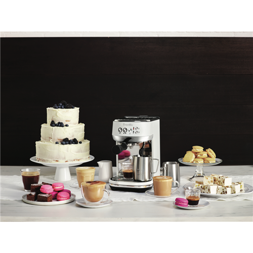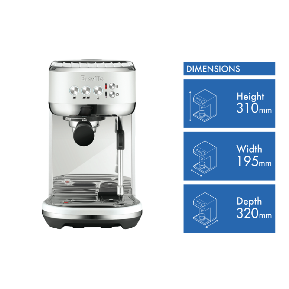 Create cafe quality cappuccinos caffe lattes or long or short blacks from the comfort of home without taking up much bench space with this compact sea salt matte white Breville Bambino Plus espresso machine. The precise Bambino Plus 19-gram dose capacity and 54mm porta-filter ensures full bodied cafe quality flavour with just the right amount of ground coffee for a balanced espresso while the low-pressure pre-infusion draws out flavours evenly during the extraction phase for a perfectly balanced tasting cup of coffee. Plus with precise PID digital temperature control water is delivered at the precise temperature required for optimal espresso extraction. Use the automatic steam wand and included milk jug to texture your way to barista quality micro-foam for a cappuccino just like at your local cafe. The Breville BES500SST4JAN1 offers a super-fast 3 second heat up time thanks to the innovative ThermoJet heating system that reaches optimum extraction temperature so you don't have to wait. Use freshly ground coffee from your local cafe or roaster or you can grind your own roasted beans using a coffee grinder (sold separately). By combining all the elements needed for a deliciously balanced brew any day is off to a great start with your favourite caffeinated beverage at home with Breville's Bambino Plus.