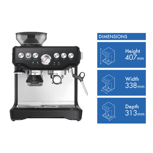 Kick start your day with cafe-quality coffee from the comfort of home with this Breville the Barista Express BES870BTR - the perfect coffee machine for both beginner baristas and more experienced coffee makers. Simply add your favourite roasted beans to the bean hopper then press a button to let the machine grind and dose your portafilter with the right amount of freshly grounded coffee for a delicious tasting brew. Select your preferred cup volume and the machine's automatic dosing will dispense the required amount of coffee. It has an adjustable grind size dial for coffee your way. To create cappuccino flat white or latte use the steam wand to texture and heat the milk to a silky-smooth consistency. This Breville espresso machine uses preinfusion to gradually increase water pressure to gently expand grinds for even extraction. Plus it automatically adjusts the water temperature after steam for optimal espresso temperature. You can experience an authentic tasting espresso or milky coffee favourite with this Breville the Barista Express coffee machine in black truffle.