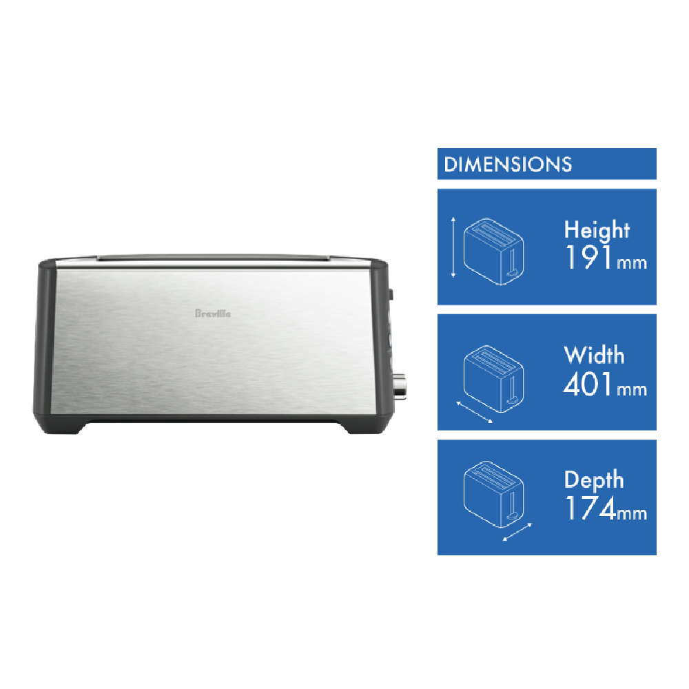 The Breville The Bit More Plus 4 Slice Toaster brings a touch of modern elegance to your kitchen countertop with its sleek stainless steel design. This 1850-watt 4-slice toaster features the signature Breville Lift and Look lever that raises and lowers toast for easy monitoring as well as a convenient A Bit More button that allows you to add a bit more time to lightly toasted bread. With generous self-centering slots variable browning control and a handy fruit bread setting this toaster can accommodate and expertly toast a variety of bread types. The removable crumb tray ensures effortless cleaning while the cord storage keeps your countertop clutter-free. Designed for durability with a 1-year manufacturer warranty the Breville The Bit More Plus 4 Slice Toaster will be a reliable breakfast companion for years to come. At 191mm high 401mm wide and 174mm deep and weighing just 1.25kg it brings convenient 4-slice toasting capabilities without taking up too much space. Make breakfast a breeze and enjoy perfect toast every time with the Breville The Bit More Plus 4 Slice Toaster. The manufacturer's part number for this product is BTA440BSS. Take your breakfast toast to the next level with this versatile and reliable 4-slice toaster from Breville.