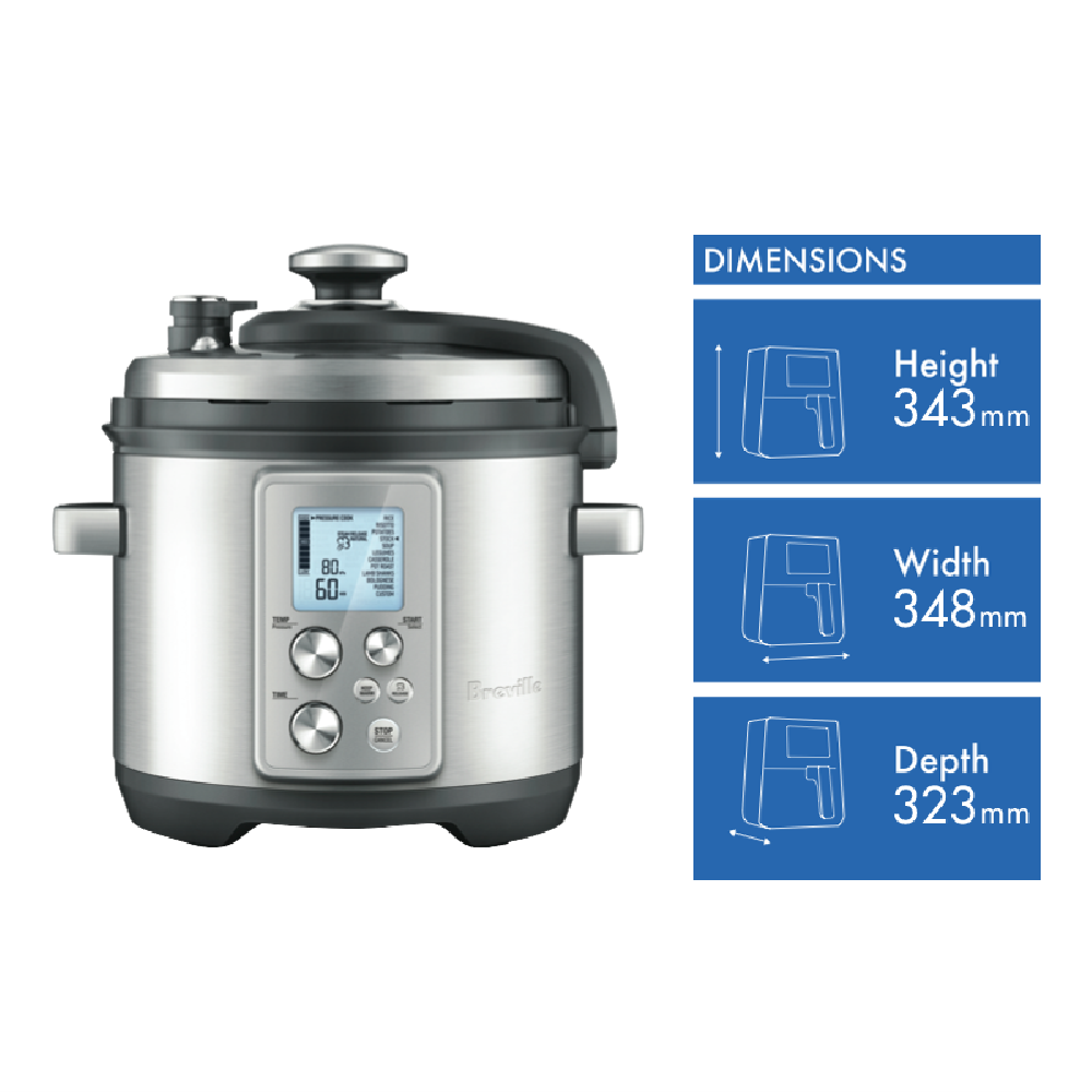 Transform your kitchen with the Breville The Fast Slow Pro Multicooker a versatile stainless steel multicooker that takes the guesswork out of cooking. With an impressive 6 litre capacity this multicooker features 6 Smart Settings including Pressure Cook Slow Cook Reduce Sear Saut and Steam so you can prepare everything from tender roasts to perfectly steamed veggies. The intuitive LCD display and 8 pressure levels allow you to fine-tune cooking times and temperatures for precision results. This multicooker's triple safe lid provides added security while the hands-free steam release offers flexibility. With 1100 watts of power a durable stainless steel exterior and multiple cooking modes like pressure and slow cooking this multicooker makes it easy to prepare delicious family meals. At 323mm wide 343mm high and 348mm deep the Breville multicooker won't take up too much space on your countertop. Plus with a 1 year warranty you can cook with confidence knowing your investment is protected. Give your cooking a versatile upgrade with the Breville The Fast Slow Pro Multicooker. The manufacturer's part number for this product is BPR700BSS.