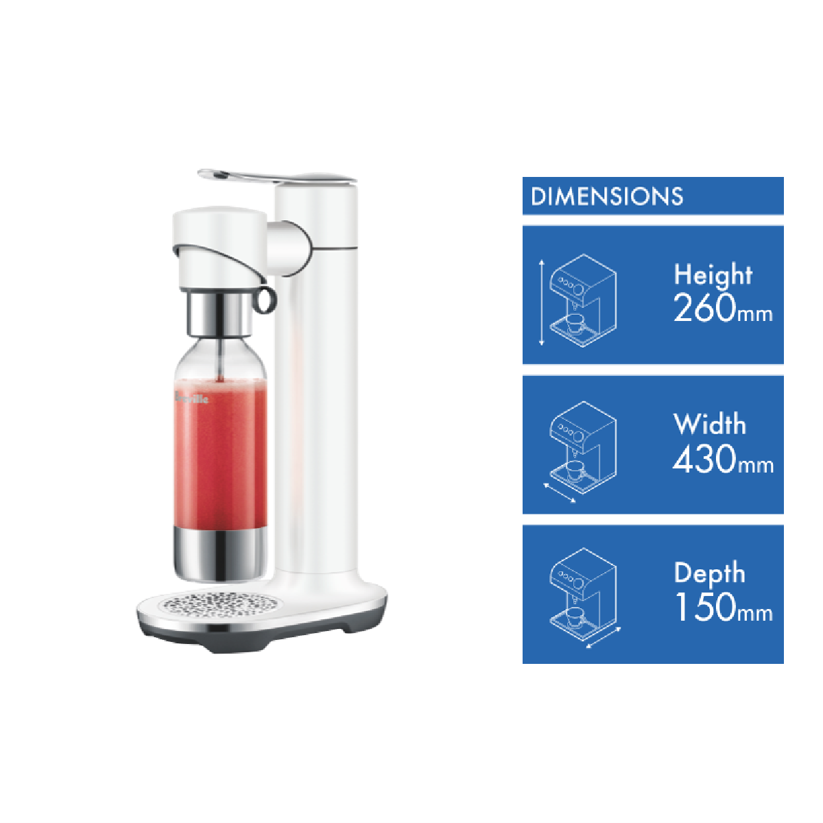 Sparkling fizz at your fingertips with the Breville The InFizz Fusion Sea Salt soda maker. Craft refreshing carbonated drinks from the comfort of home with this sleek stainless steel appliance. The unique FusionCap gives you total control over carbonation fast or slow depending on your beverage. Simply add juice tea wine or flavored syrups to the 1L bottle pull the ergonomic ring-pull lever and watch the bubbles rise. With the turn of a dial adjust the fizz to suit sodas cocktails sparkling water and more. The specially designed cap infuses drinks with CO2 while keeping them fresh and sealed. Plus the dishwasher-safe bottle ensures easy cleanup after use. At 430mm wide this compact soda maker fits perfectly on countertops without taking up too much space. Start enjoying bubbling homemade beverages with the brilliant Breville infusion soda maker today. The manufacturer's part number for this product is BCA800SST0ZAN1. Check out this soda maker and the full range of Breville kitchen appliances online or in store now.