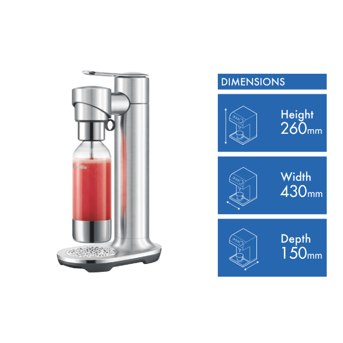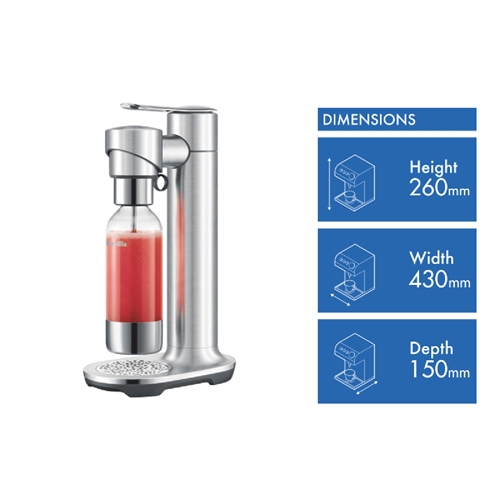 Make expertly crafted carbonated drinks at home with the Breville The InFizz Fusion Stainless Steel soda maker. This innovative appliance allows you to fizz juice tea cocktails wine and re-fizz soda with the one-of-a-kind FusionCap that gives you complete control over CO2 release - fast or slow carbonation depending on your drink. The ergonomic stainless steel body features a unique locking system with ring pull lever for easy use. It includes a 1L bottle with stainless steel cap and base cleaning brush funnel and sieve. With a 2 year manufacturer's warranty 430mm width 150mm depth 260mm height and 1L capacity this soda maker is the ultimate way to make bubbly beverages just the way you like them. The manufacturer's part number for this product is BCA800BSS0ZAN1. Unleash your inner mixologist with the Breville InFizz today.