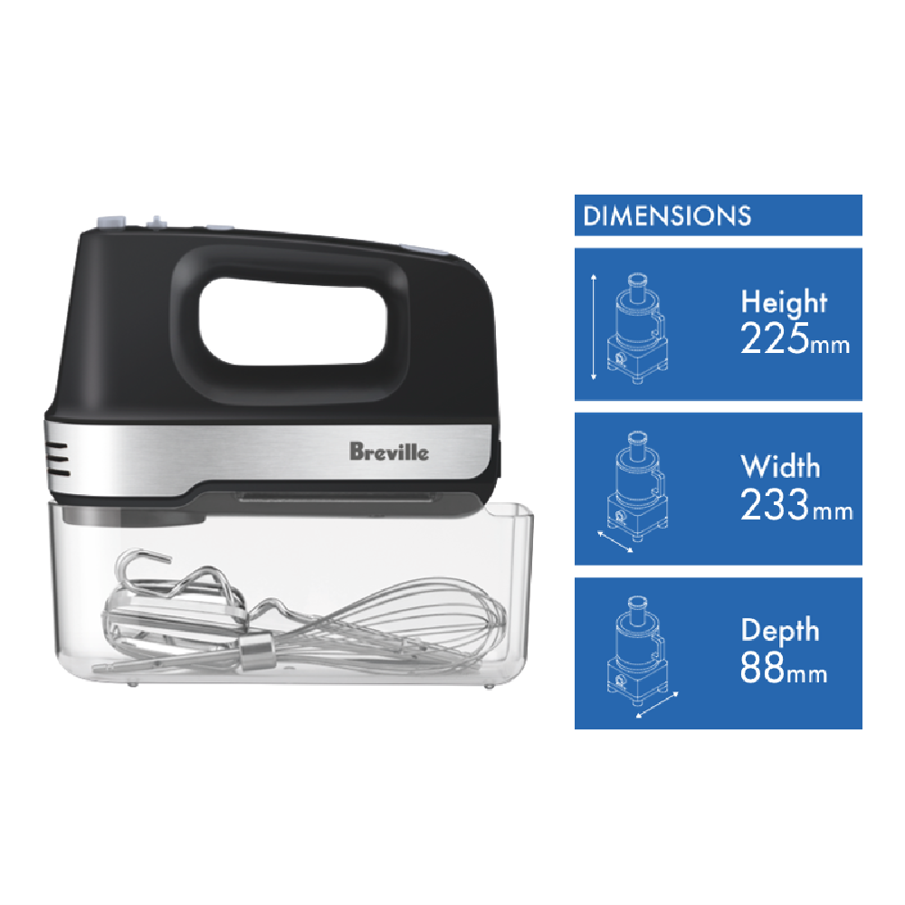 Move over stale kitchen appliances and make way for the Breville The Mix And Store Turbo Hand Mixer. With a powerful 200W DC motor and 5 speed settings plus turbo boost this matte black hand mixer makes light work of all your baking and mixing tasks. The plastic housing feels good in your hands while the retractable cord keeps your benchtop clutter-free. Switch easily between the mix knead and whisk settings to achieve the perfect texture for cakes cookies breads and more. Breville includes 2 beaters 2 dough hooks and a wire whisk stored neatly in the attachments case so you have all the tools you need. And when you're done the storage case keeps everything together in one place. Don't be fooled by its compact size - this versatile mixer packs a real punch. So treat yourself to effortless mixing with the LHM200MTB2IAN1 Breville The Mix And Store Turbo Hand Mixer. Covered by a 1 year warranty.