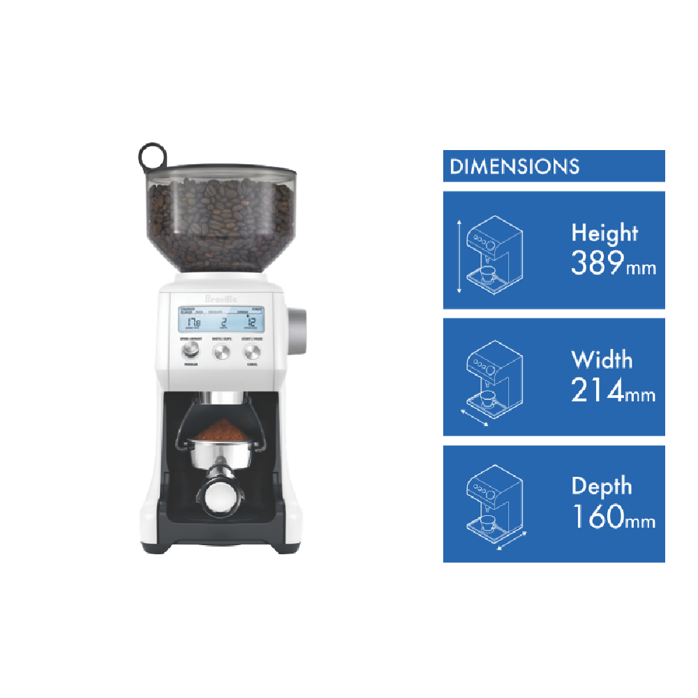Want to grind coffee beans like a pro? This Breville Smart Grinder Pro in Sea Salt makes it easy. With 60 grind settings you can get the perfect consistency for any brew method. The 450g removable bean hopper lets you switch between different beans without hassle. Use the Dosing IQ tech to get just the right amount for your cup or shot. The LCD display keeps you in control while the dose pause function lets you adjust mid-grind. It even comes with two grinding cradles for dosing directly into espresso filters. Plus the air-tight container keeps your grounds fresh. At 389mm tall 160mm wide and 214mm deep it won't hog counter space. Backed by a 2-year warranty this 2.78kg grinder is a solid choice for coffee lovers. Model number: BCG820SST.