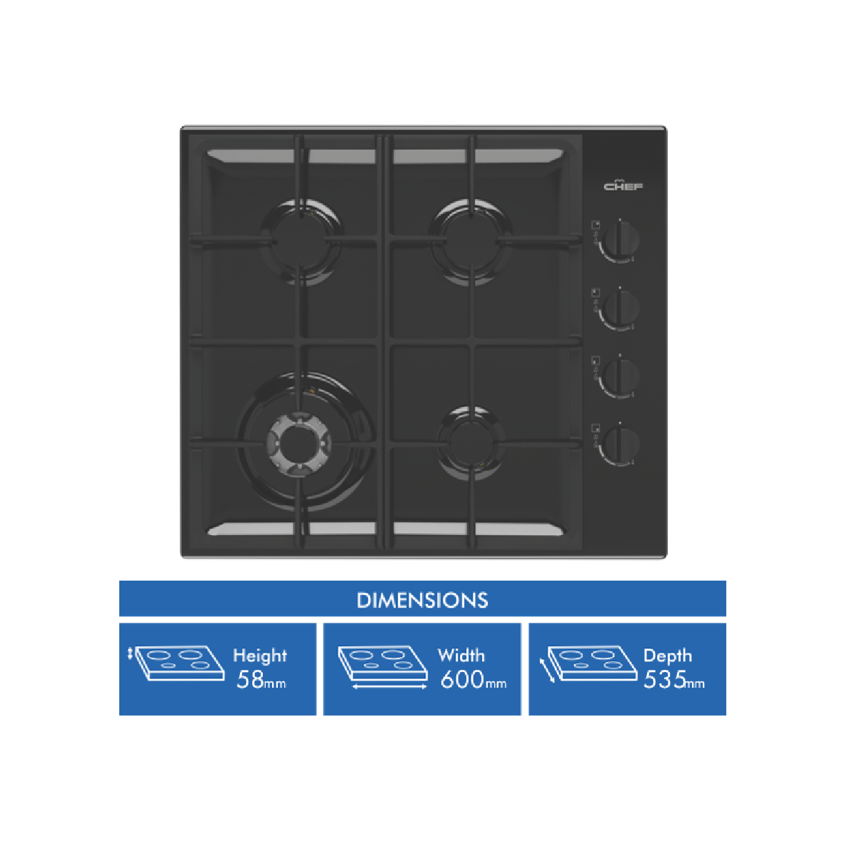 This Chef 60cm Gas Cooktop Black CHG644DC has a high-powered wok burner so you can achieve the required intensity for delicious stir fry at home. Controls are positioned to the side for safety; eliminating the need to reach over hot pots and pans whilst offering quick and easy changes to the heat intensity at any given time. Experience one-push start ignition every cook. Plus Chef's cast iron trivets keep your pots and pans stable as well as allowing for ease of movement between burners. It has an easy-to-clean black enamel surface with black controls for a minimalist addition to any kitchen.