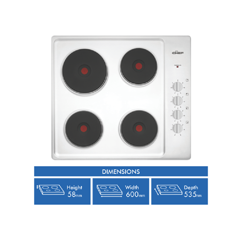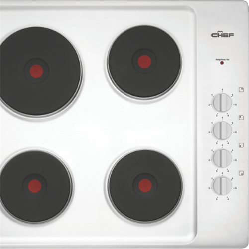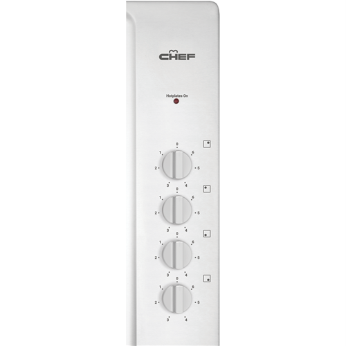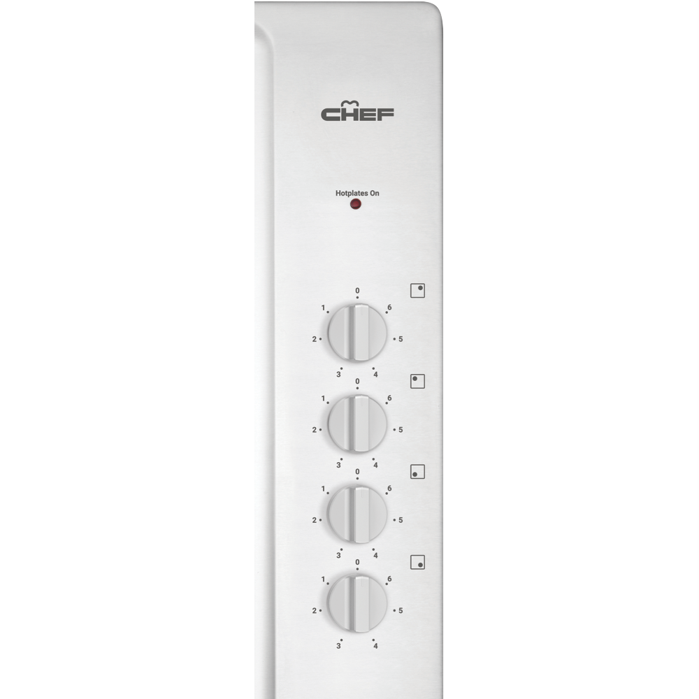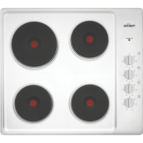 Create meals with variety using the Chef 60cm Electric Cooktop stainless steel CHS642SB and its four cooking zones. Controls are positioned to the side for safety whilst offering quick and easy changes to the heat intensity at any given time. Heating lamp indicators make it clear which zone is in operation while the easy-to-clean stainless steel finish and corrosion resistant solid hotplates offer easy upkeep and durability. Make delicious food without fuss with this Chef cooktop.