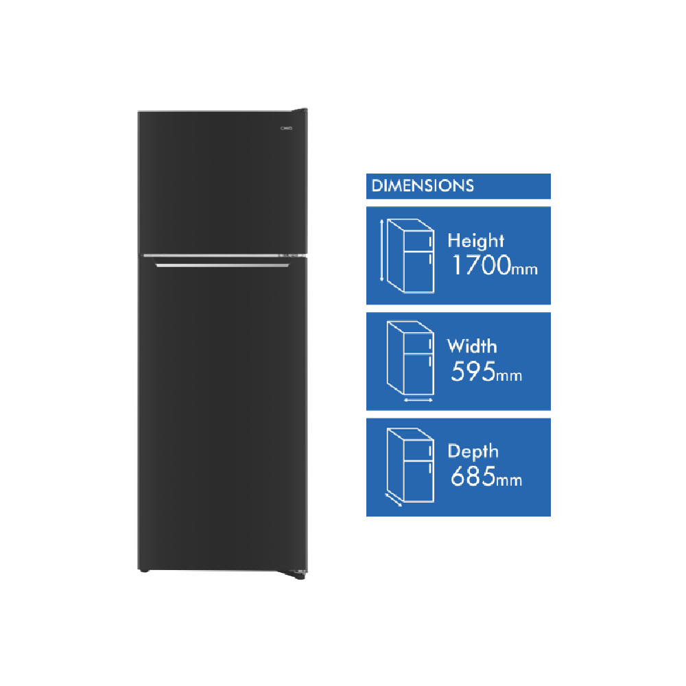 Take control of your kitchen with the CHiQ 348L Top Mount Refrigerator. This stylish black fridge offers impressive and efficient cooling for busy families. Featuring an eco-friendly 5 star energy rating and a spacious 348 litre capacity across 270 litres in the fridge and 78 litres in the freezer this top mount model provides ample chilled storage for fresh food and frozen goods. The multi air flow and fast cooling capabilities ensure optimum temperatures throughout while the inverter compressor helps minimize energy consumption. With reversible doors interior LED lighting and handy storage features like the humidity controlled crisper and door alarm it's the ideal fridge for any home. Additional highlights include the frost free operation which prevents icy buildup and the tempered glass shelves that safely contain spills. Covered by a 3 year manufacturer's warranty the CHiQ CTM347NB5E fridge makes refrigeration simple. Order now to keep food fresh for less energy.