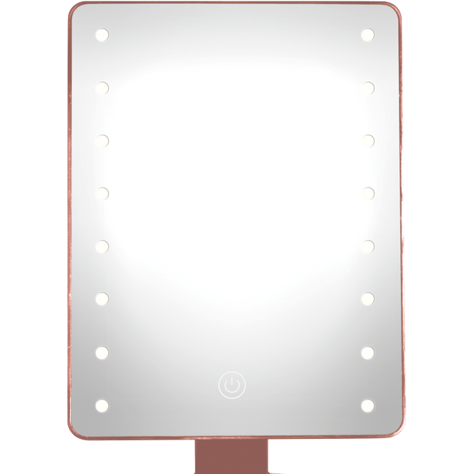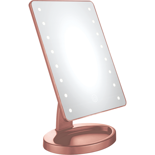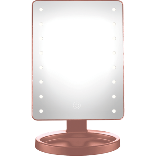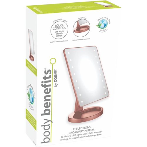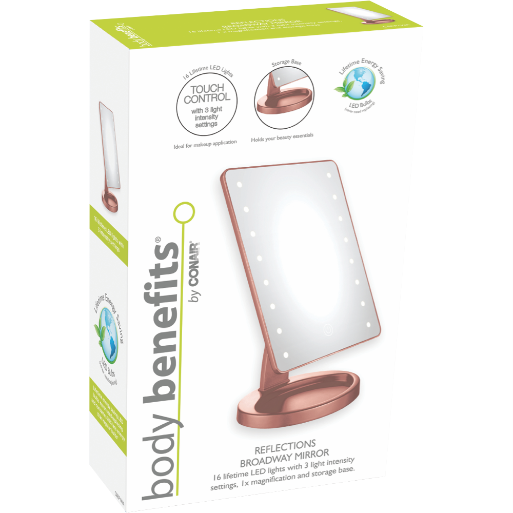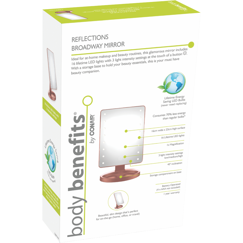 Elevate your beauty routine with the Reflections Broadway Mirror featuring 16 energy-saving LED bulbs that never need replacing. This cosmetic mirror comes with three light settings to match any environment while its five fixed inclinations allow you to tilt it up to 40 degrees for the perfect angle. The rose gold finish adds a touch of elegance and the convenient storage base keeps your essentials within reach. Since it's battery-powered you can place it anywhere just remember you'll need 4 AAA batteries to get started. Includes a 1-year warranty. Model CBEP1WA.