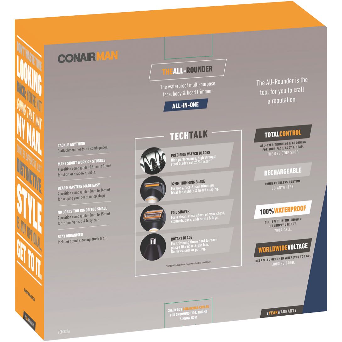 Tackle grooming tasks from head to toe with the versatile ConairMan The All-Rounder. This cordless rechargeable body trimmer's precision blades and sturdy construction provide smooth trims wet or dry. With an impressive 8 hour battery life you can shape and maintain facial hair trim chest and back hair or keep body hair tidy in the shower. The stainless steel blades stay sharp and resist corrosion while the waterproof design allows for easy cleaning. Multiple combs a foil shaver and precision attachments handle everything from subtle beard detailing to close shaves. Convenient charging stand keeps The All-Rounder powered up and ready for daily grooming. Backed by a 2 year warranty this body trimmer's versatility and high performance deliver smooth results across all body zones. The manufacturer's part number for this product is VSM837A. Check out The All-Rounder today for your total body grooming solution.