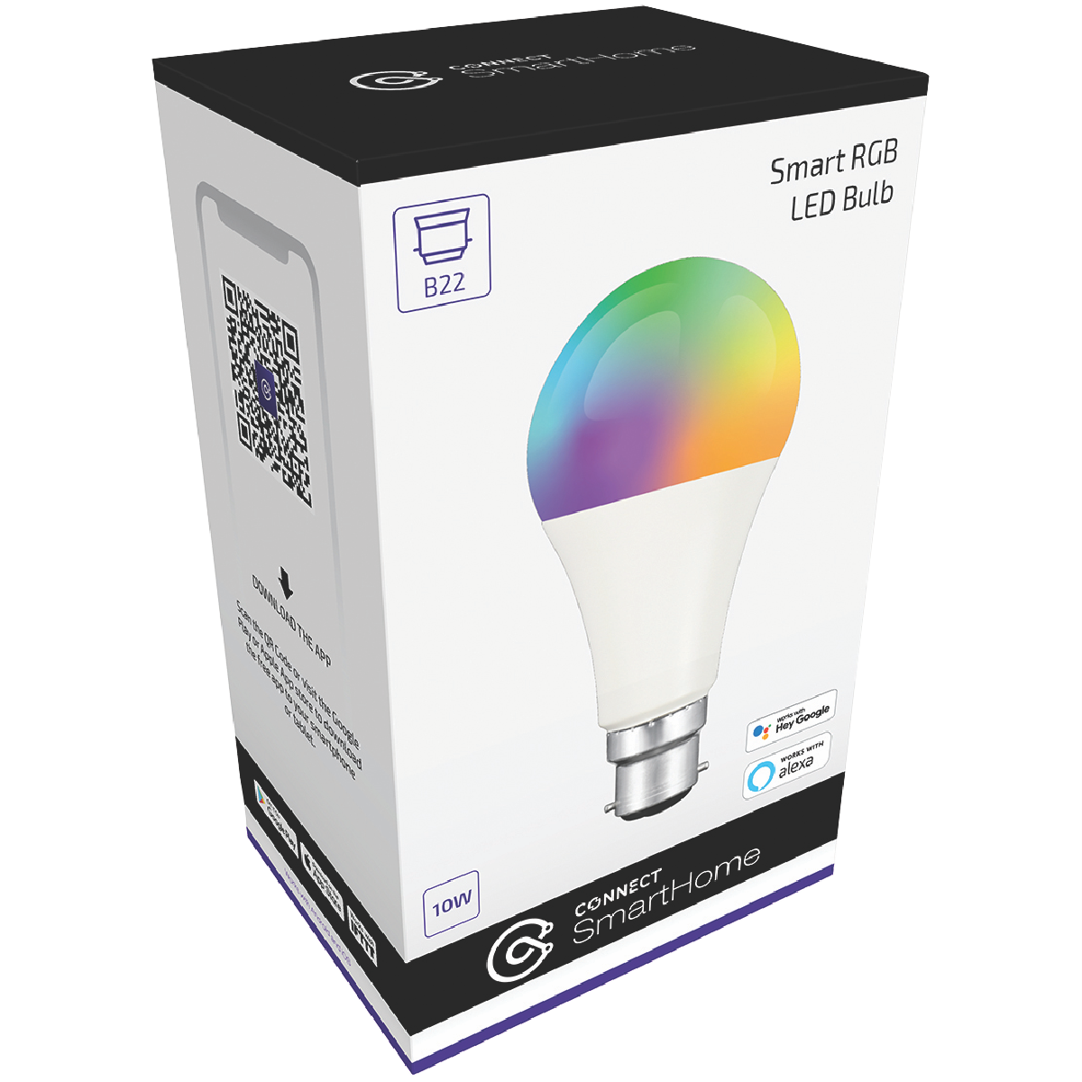 Bring colour and light to any room with the Connect SmartHome 10W Multi-colour B22 Smart Bulb. This smart lighting solution packs 16 million dazzling hues and a bright 1000 lumens into a single energy-efficient LED bulb. Simply screw it into any B22 socket and control it right from your phone via the Connect SmartHome app. Set schedules dim to the perfect mood lighting or ask Google Assistant or Amazon Alexa to turn the colour to match your vibe. With a long 1 year warranty this versatile smart bulb is designed for seamless voice and app integration letting you automate and customise your lighting with ease. From soft and subtle to vivid and vibrant this bulb has your lighting needs covered. Transform any lamp or fixture into a smart lighting hub today. The manufacturer's part number for this product is CSH-B22RGB10W. Discover the convenience of smart lighting solutions with Connect SmartHome.