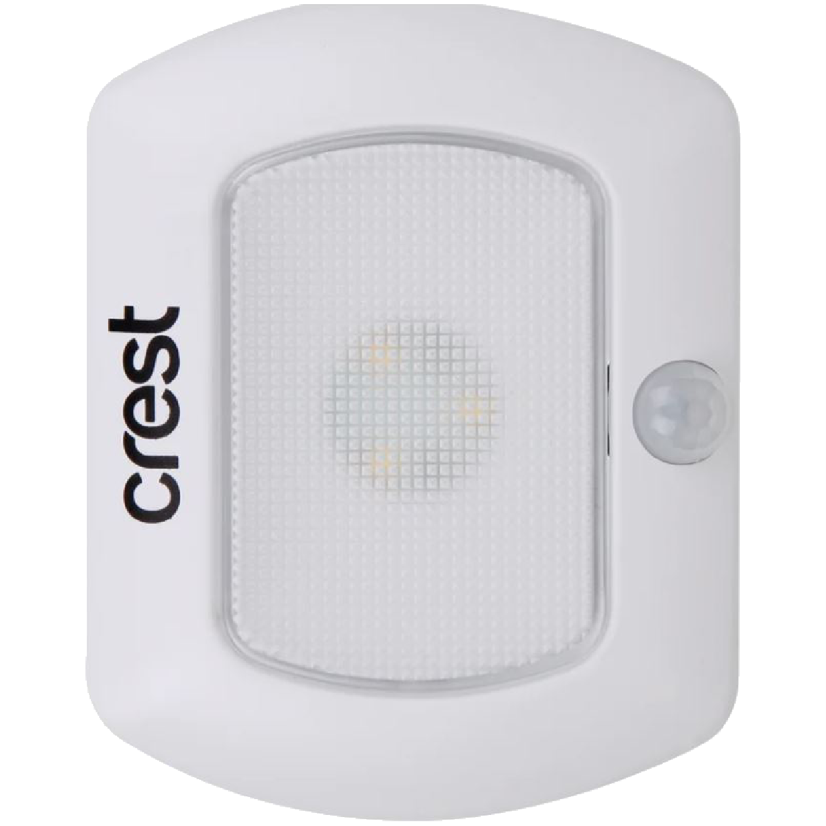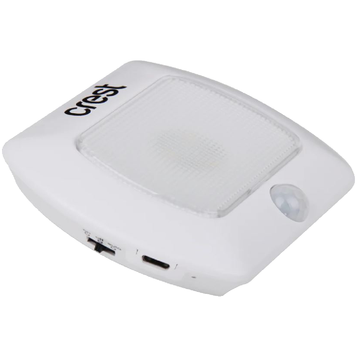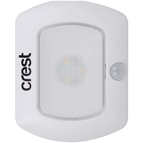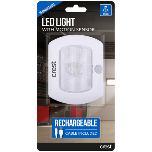 With a sleek and compact design the Crest Rechargeable Motion Sensor Light provides convenient hands-free illumination. This LED night light activates automatically when motion is detected lighting up hallways entries bathrooms and more with a bright white glow. Powered by a built-in 600mAh lithium battery that recharges via USB it provides cordless operation and can be installed anywhere without outlets. The light's sensitive motion sensor responds to movement up to 10 feet away. As soon as activity ceases the light gently fades out conserving power. This energy-efficient LED light is an ideal solution for lighting up dark areas safely at night while avoiding unnecessary energy waste. With an impressive 1-year warranty the Crest Rechargeable Motion Sensor Light delivers motion-activated convenience and cordless versatility for your home. The manufacturer's part number for this product is PWL04M. Conveniently illuminate dark spaces automatically with the Crest Motion Sensor Light.