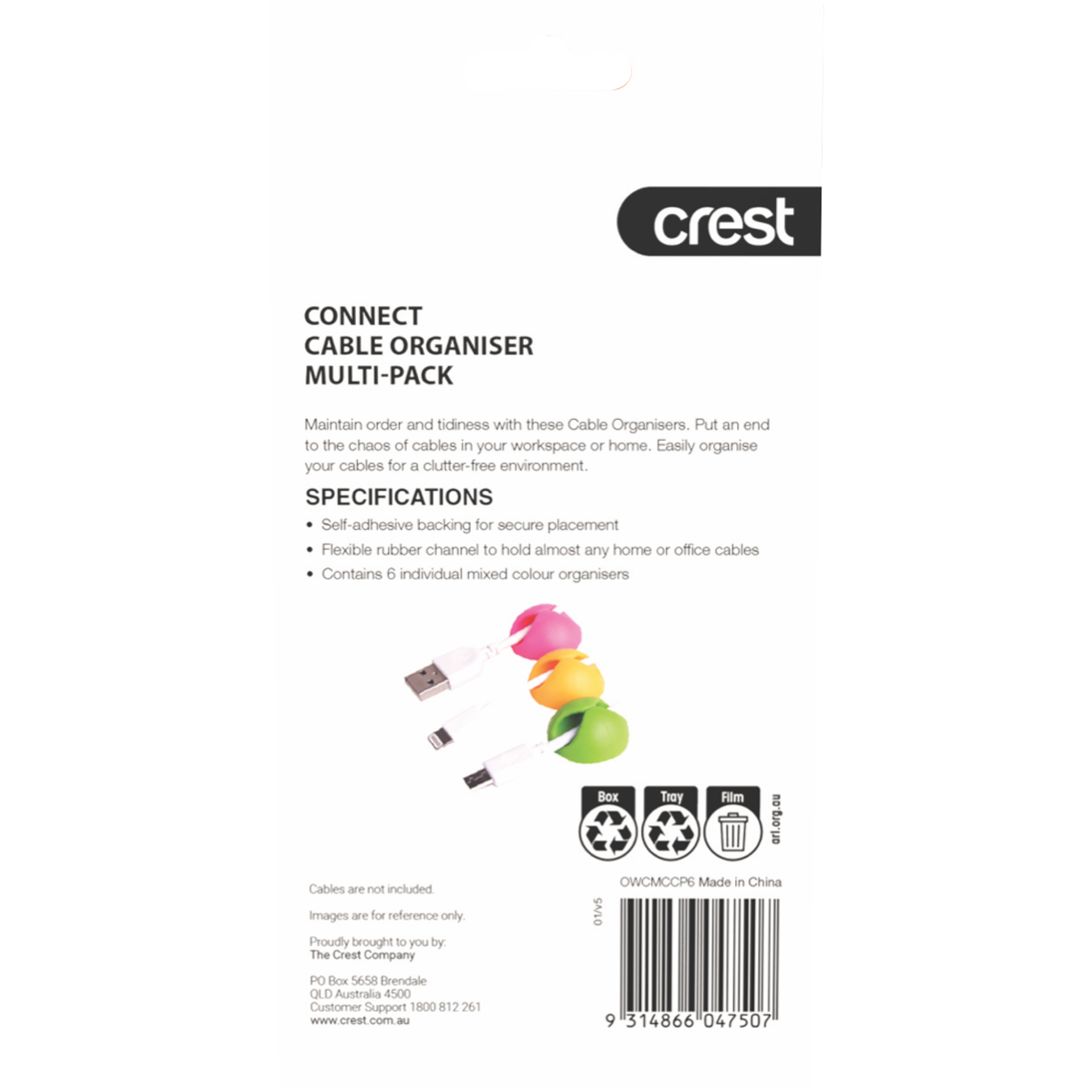 Keep your cables neat and tidy with these Crest Cord Grippers. This handy 6-pack lets you organize messy cables around your desk entertainment setup or gaming area. Simply attach them to your cables and secure them where you need - no more tangled wires or cables running everywhere. They're a practical solution for anyone looking to clean up their workspace or gaming station. Comes with a 1 year manufacturer's warranty for peace of mind. Model number: OWCMCCP6.