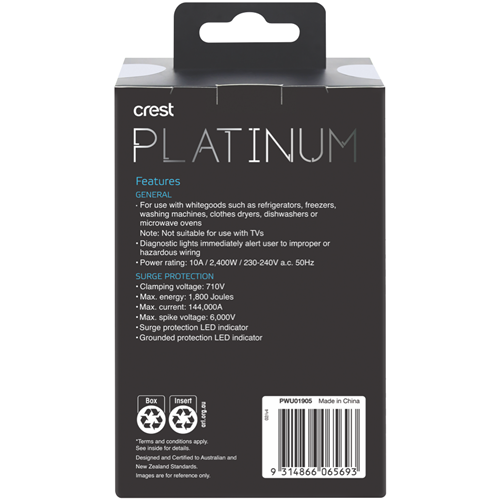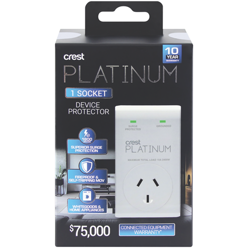 Protect your electronics from power surges with the Crest Single Socket Surge Protector. This surge protector features one outlet to plug in and power your essential devices. The built-in surge protection guards your equipment against sudden spikes in voltage preventing damage from lightning strikes and power fluctuations. You can rest assured knowing this surge protector comes backed by a 10 year manufacturer's warranty. Plug in computers TVs gaming consoles and more with confidence knowing the Crest Single Socket Surge Protector has your back. With its sleek compact design it tucks away neatly behind furniture and entertainment units. Give your electronics an extra layer of defense against power surges today for long-lasting performance you can rely on. The manufacturer's part number for this product is PWU01905. Check out the Crest Single Socket Surge Protector now to safeguard your devices.