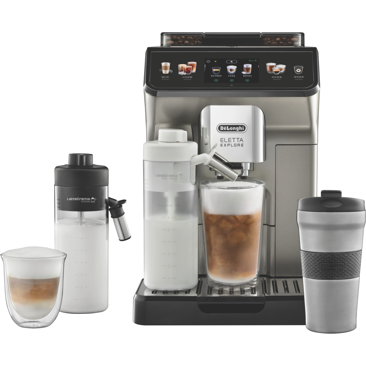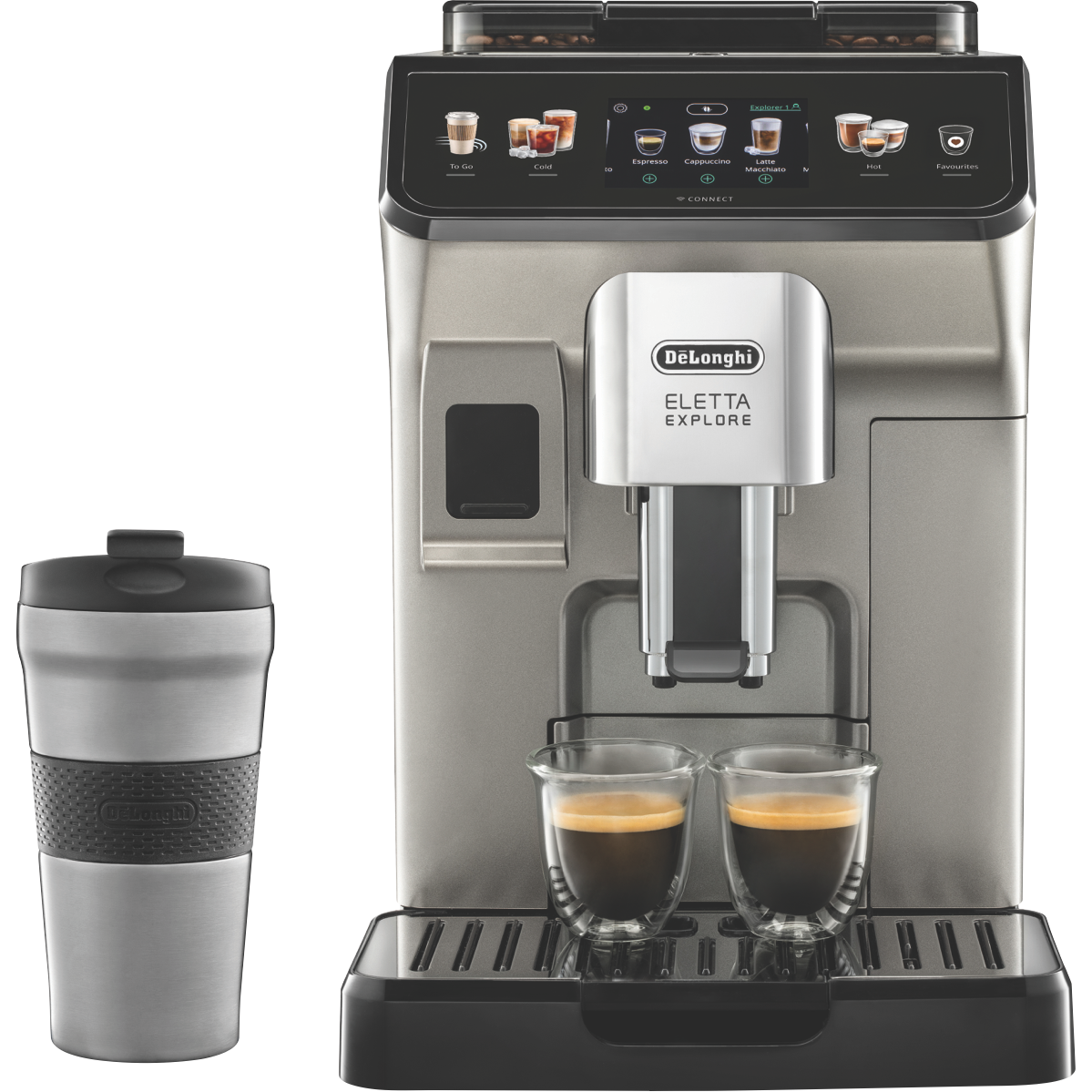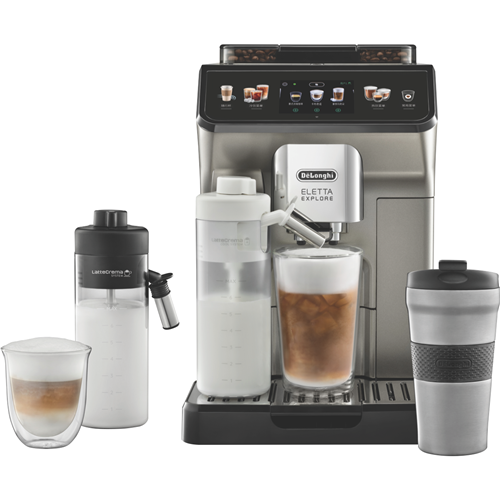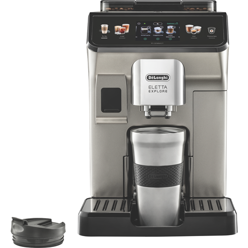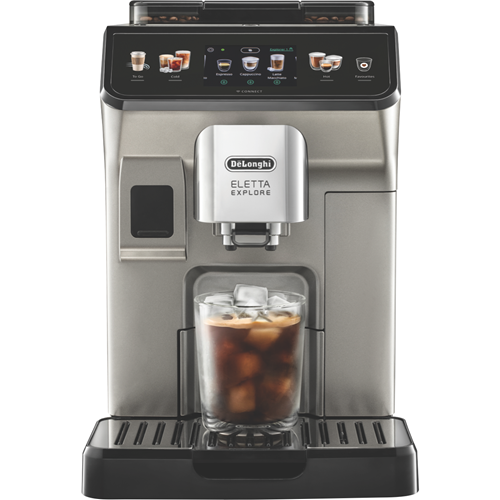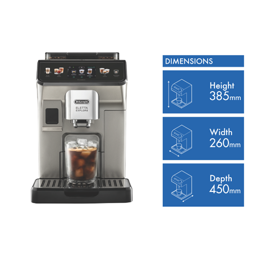 Brew barista-quality coffee from the comfort of your own home with the DeLonghi Eletta Explore Wifi Connect Titan automatic coffee machine. This sleek titanium automatic coffee machine allows you to easily craft delicious espresso long blacks and lattes at the touch of a button. With a powerful 19 bar pump and patented LatteCrema system the Eletta Explore delivers creamy milk froth and optimally extracted coffee every time. Connect via WiFi to access 5 customizable user profiles adjust grind size coffee strength and milk temperature and more through the intuitive 3.5 TFT display. The integrated conical burr grinder with 13 adjustable settings grinds beans fresh for each brew while the removable 1.8L water tank and dishwasher safe parts make cleaning and descaling easy. Brew coffee just the way you like it with the Eletta Explore's wide range of features. The manufacturer's part number for this product is ECAM45086T. Make your choice today with this user-friendly bean-to-cup automatic coffee machine from DeLonghi.
