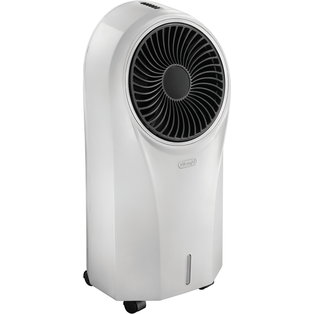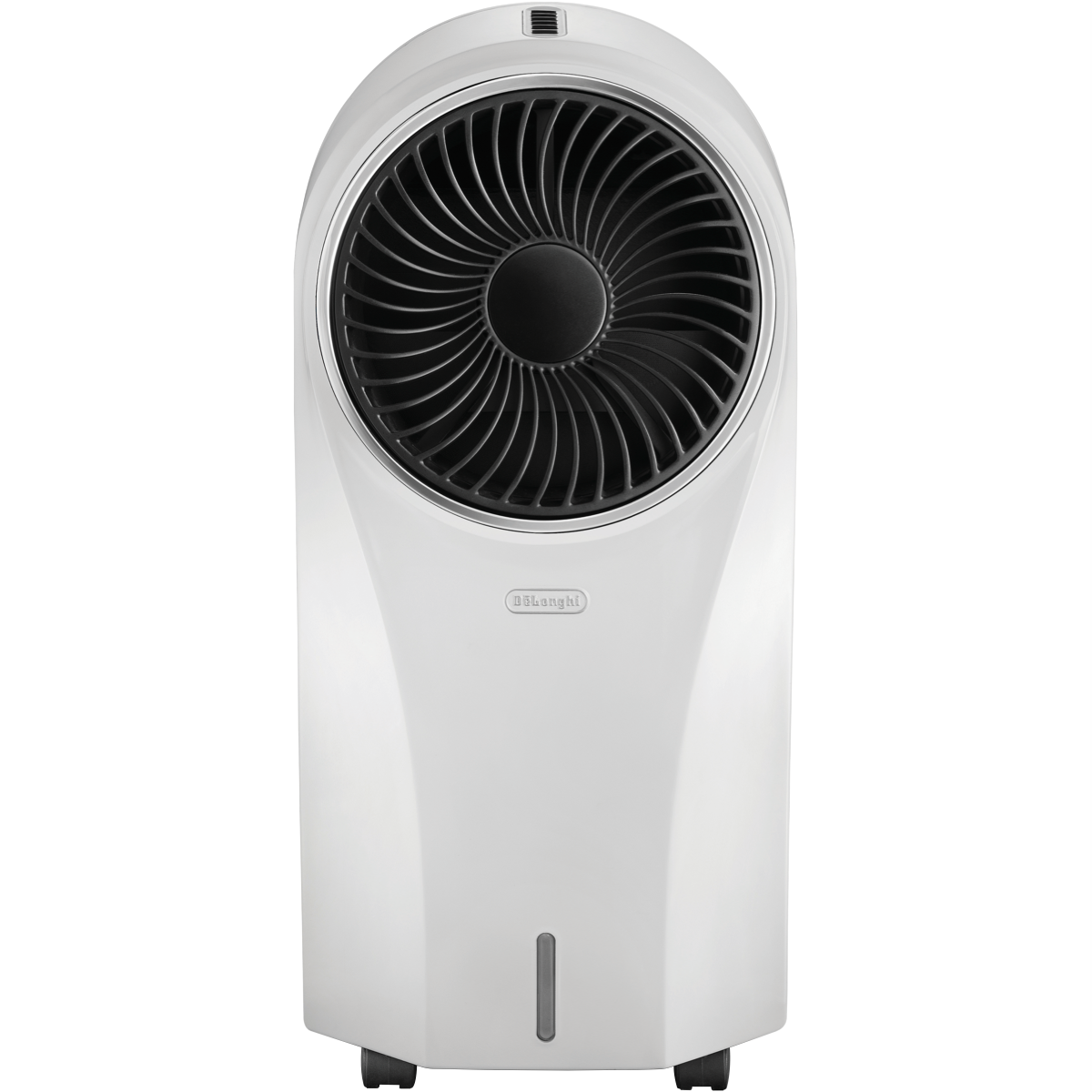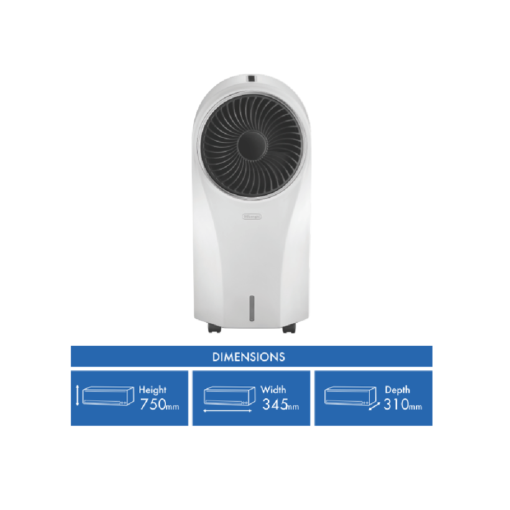With its sleek white design the DeLonghi Evaporative Cooler brings efficient and effective cooling to your home. This portable air conditioner features a generous 800m/h cooling capacity from its evaporative system dispersing cool air through three fan speeds. The large 4.5L water tank allows up to 6 hours of continuous use while the included remote control lets you adjust settings without leaving your seat. With a 1-year warranty from DeLonghi ionizer to purify incoming air and handy dust filter for reduced cleaning this model provides a smart way to beat the heat. The EV250WH has a width of 345mm height of 750mm and depth of 310mm giving you versatile placement options. Bring fresh cool air into your living space with the DeLonghi Evaporative Cooler. The manufacturer's part number for this product is EV250WH. Invest in long-lasting relief from summer heat today.