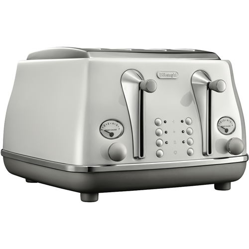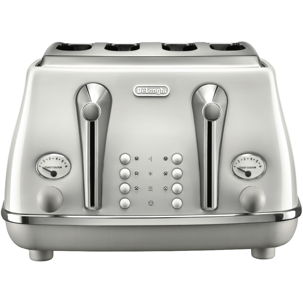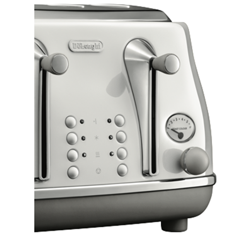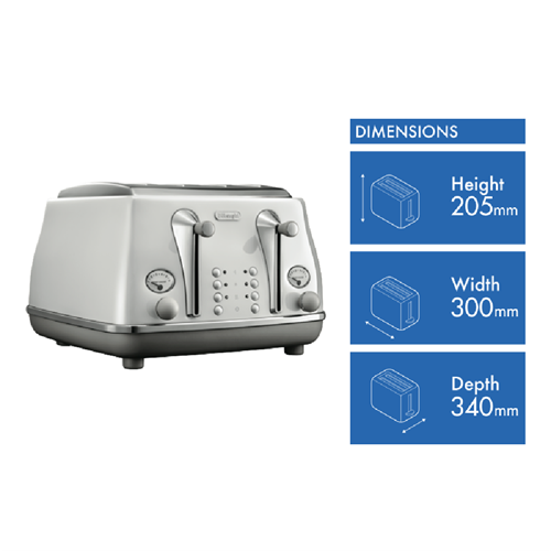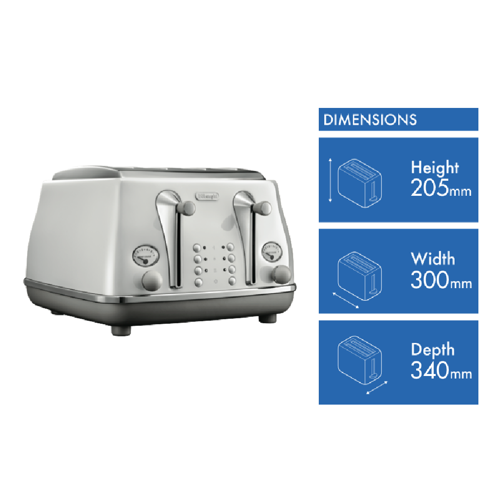 Start your mornings right with the elegant DeLonghi Icona Capitals 4 Slice Toaster in stunning Sydney White. With 1800 Watts of power this sleek toaster can evenly toast up to 4 slices of bread at a time. The progressive electronic browning controls allow you to achieve the perfect level of golden-brown toastiness while the high lift lever makes it easy to remove even small slices of bread. The removable crumb tray ensures effortless cleaning. Reheat and defrost functions provide flexibility for reheating toast or defrosting frozen bread. This DeLonghi toaster features neon indicator lights for all functions so you can monitor progress at a glance. With a compact footprint measuring 300mm wide by 340mm deep it will look fantastic on any kitchen benchtop. The durable stainless steel body promises longevity while the 2 year warranty provides peace of mind. Give your mornings an elegant touch with the DeLonghi Icona Capitals 4 Slice Toaster in Sydney White. The manufacturer's part number for this product is CTOC4003W. Make your purchase today for perfectly toasted bread every morning.