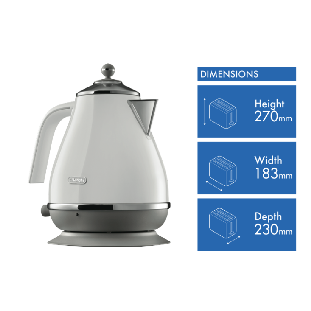 Bring elegance and sophistication to your kitchen with the DeLonghi Icona Capitals White Kettle. This stylish 1.7L kettle features a sleek white finish that will complement any décor. The 360 degree swivel base provides easy mobility while the removable washable anti-scale filter ensures pure tasting water every time. Enjoy cordless convenience thanks to the detachable base and monitor your boil with the convenient water level indicator and water window. With 2000W of power this kettle boils water rapidly so you can enjoy a hot cup of tea in no time. The manufacturer's part number for this product is KBOC2001W. See for yourself how this beautiful yet functional kettle can enhance your daily tea or coffee ritual.