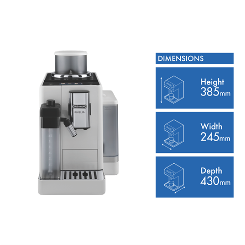 Brew barista-quality coffee drinks at home with the DeLonghi Rivelia Fully Automatic Coffee Machine in Arctic White. This sleek fully automatic espresso machine delivers freshly ground beans and milk on demand for authentic cappuccinos lattes and more with just the push of a button. The 19 bar pump pressure extracts maximum flavor from coffee grounds while the interchangeable dual bean hoppers let you switch between two types of beans easily. Choose from 16 coffee and milk drinks like espresso cappuccino latte macchiato and more at the touch of a button. The built-in milk frother whips up silky smooth foam to top your drinks. With a 1.4 liter removable water tank adjustable spouts and a digital display this coffee machine takes the guesswork out of brewing while letting you customize your beverages. Designed for convenience the Rivelia coffee machine features automatic cleaning and descaling functions to maintain performance. Measuring 385mm high 430mm deep and 245mm wide this compact countertop appliance weighs 9.7kg for easy placement in your kitchen. Covered by a 2 year manufacturer's warranty the DeLonghi Rivelia Fully Automatic Espresso Machine delivers cafe-quality coffee with push-button simplicity. EXAM44055W is the manufacturer's part number for this product. Bring the joy of coffeehouse drinks home every day with this versatile machine.