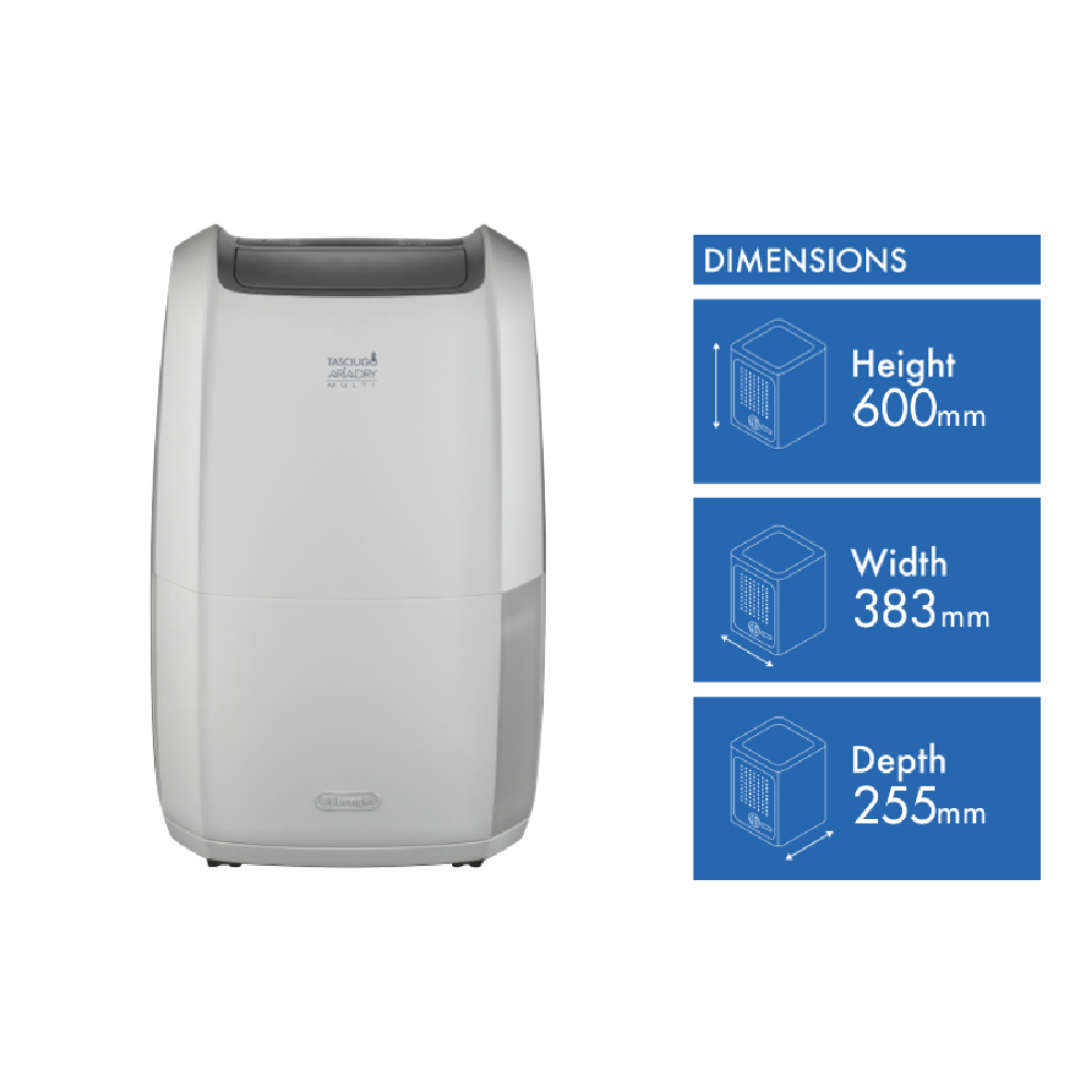 Say goodbye to excess moisture and hello to a healthier home with the DeLonghi Tasciugo AriaDry Multi 25L Dehumidifier. This powerful unit removes up to 25 litres of moisture in just 24 hours making it perfect for spaces up to 100m3. The 5L tank capacity and continuous drainage option provide convenient moisture management while the 12-hour timer and Wi-Fi connectivity offer effortless control. With a comprehensive filtration system featuring an EPA 12 filter dust filter BioSilver filter and AntiAllergy filter you can breathe easy knowing your air is clean and fresh. Three ventilation speeds allow you to customize comfort and the sleek white design seamlessly blends into any décor. Measuring 600mm high 383mm wide and 255mm deep and weighing just 13.5kg this dehumidifier is a breeze to move and store. Experience the difference of a drier healthier home with the DeLonghi Tasciugo AriaDry Multi 25L Dehumidifier model DDSX225WF. Backed by a 1-year manufacturer's warranty for added peace of mind.
