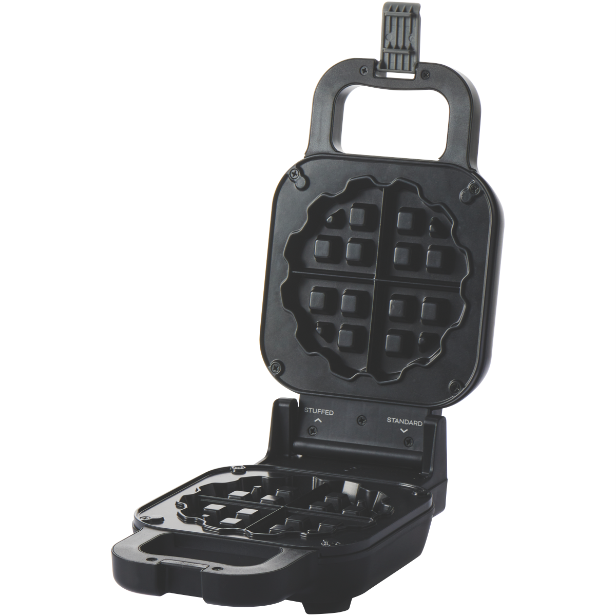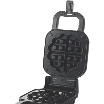 Settings On/off, Includes Waffle Ring for stuffed waffles