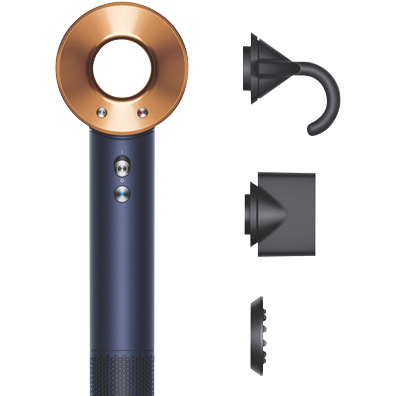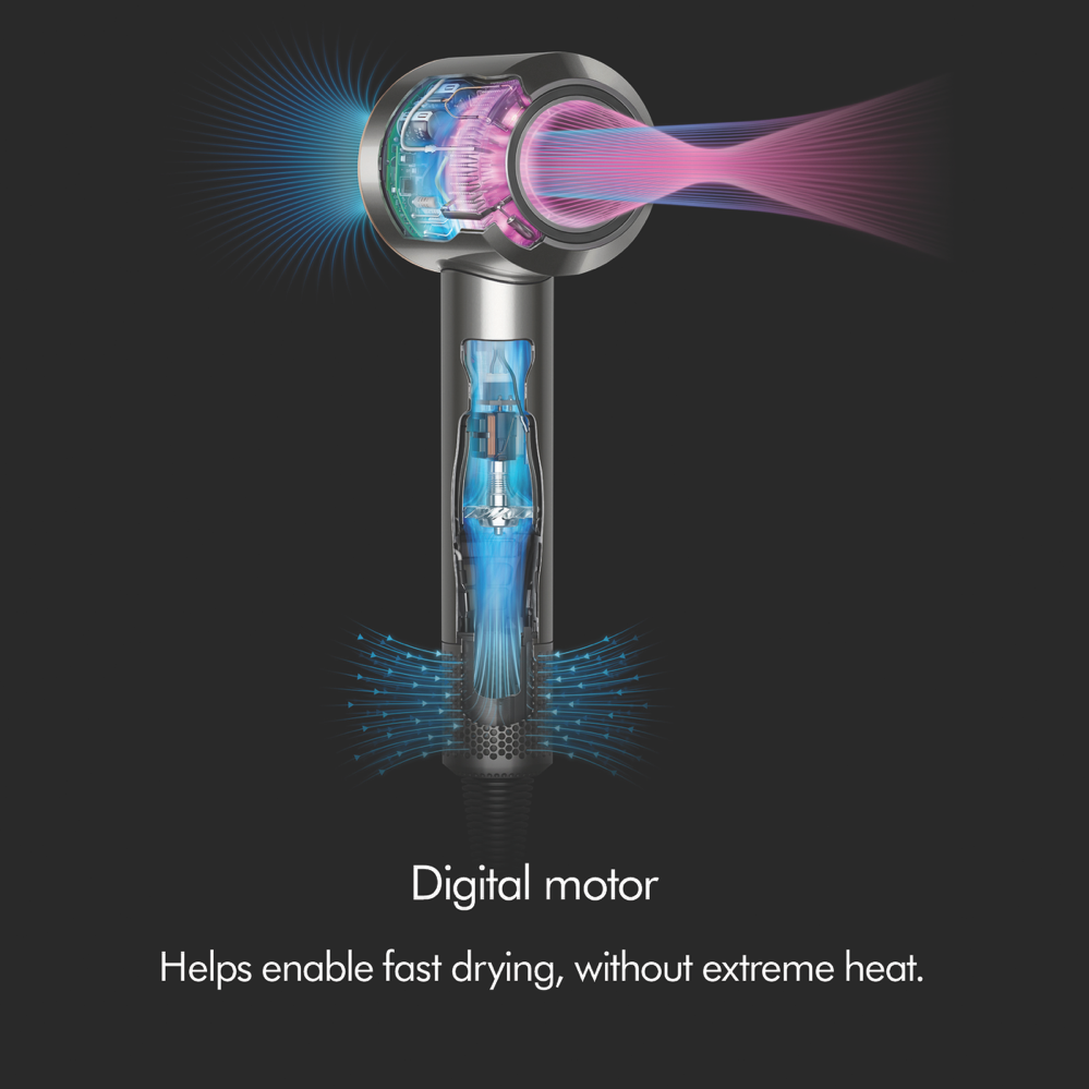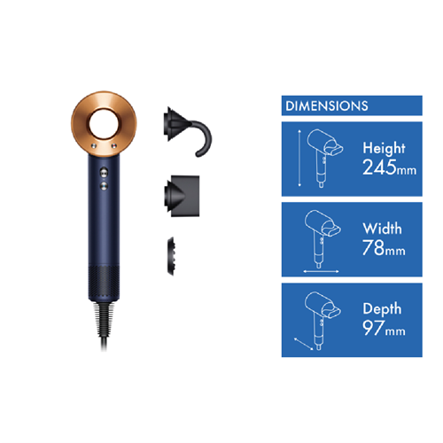 Style your hair quickly and gently with the Dyson Supersonic Hair Dryer in Prussian Blue. This smart dryer protects your hair's natural shine by measuring temperature over 40 times per second to prevent heat damage. The powerful digital motor spins at up to 110000rpm while Air Multiplie technology creates a controlled jet of air for fast drying and precise styling. Choose from 4 heat settings (including a cold shot) and 3 speed options to suit your hair type. It comes with three attachments - a styling concentrator gentle air attachment and flyaway attachment - perfect for straight and wavy hair. Backed by a 2 year warranty. Model number: 113297-01.