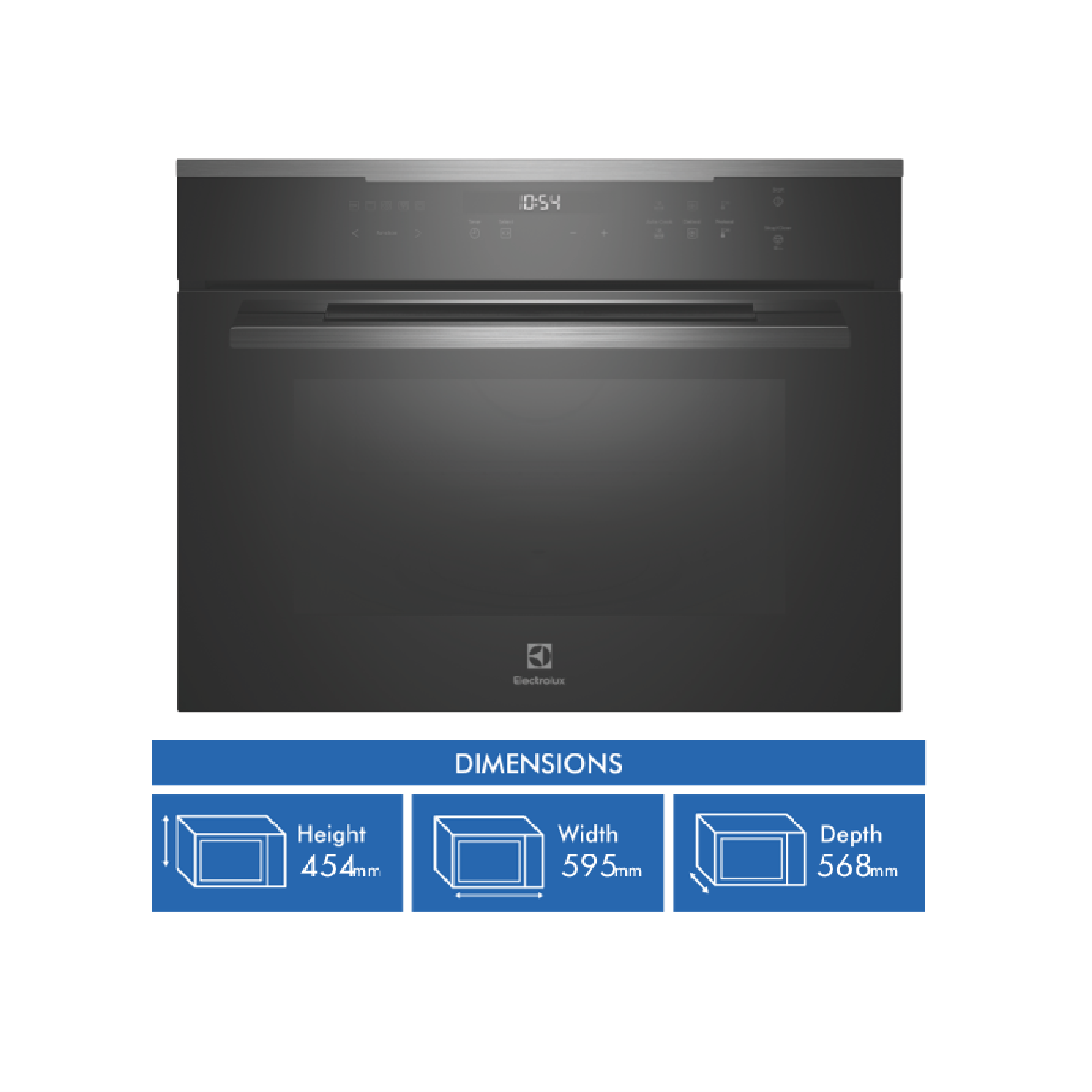 Cook up a storm thanks to the versatility of this Electrolux 44 Litre Compact Combination Microwave EVEM645DSE with the option of combining microwave grill and convection oven functions in one to ensure your baked casseroles cook thoroughly and fast while browning the outside at the same time. It has 13 Auto Cook menu options including 'Bakery' so you can bring quiche or apple pie to the perfect temperature based on the weight inputted or 'Vegetables' to get fresh veggies cooked just right as a side to tonight's main. Combination cooking options aside you can choose 'Microwave' for re-heating 'Grill' for healthy chicken skewers with less oil 'Hot Air' for the baking convection setting or 'Pizza' for perfectly cooked pizza from frozen. It has two Defrosting programmes for more precise results - one for meat poultry and fish and one for bread or cake. In a dark stainless steel trim this Electrolux built-in combi microwave oven is a stylish addition to your kitchen with seamless integration into your cabinetry for a uniform look.