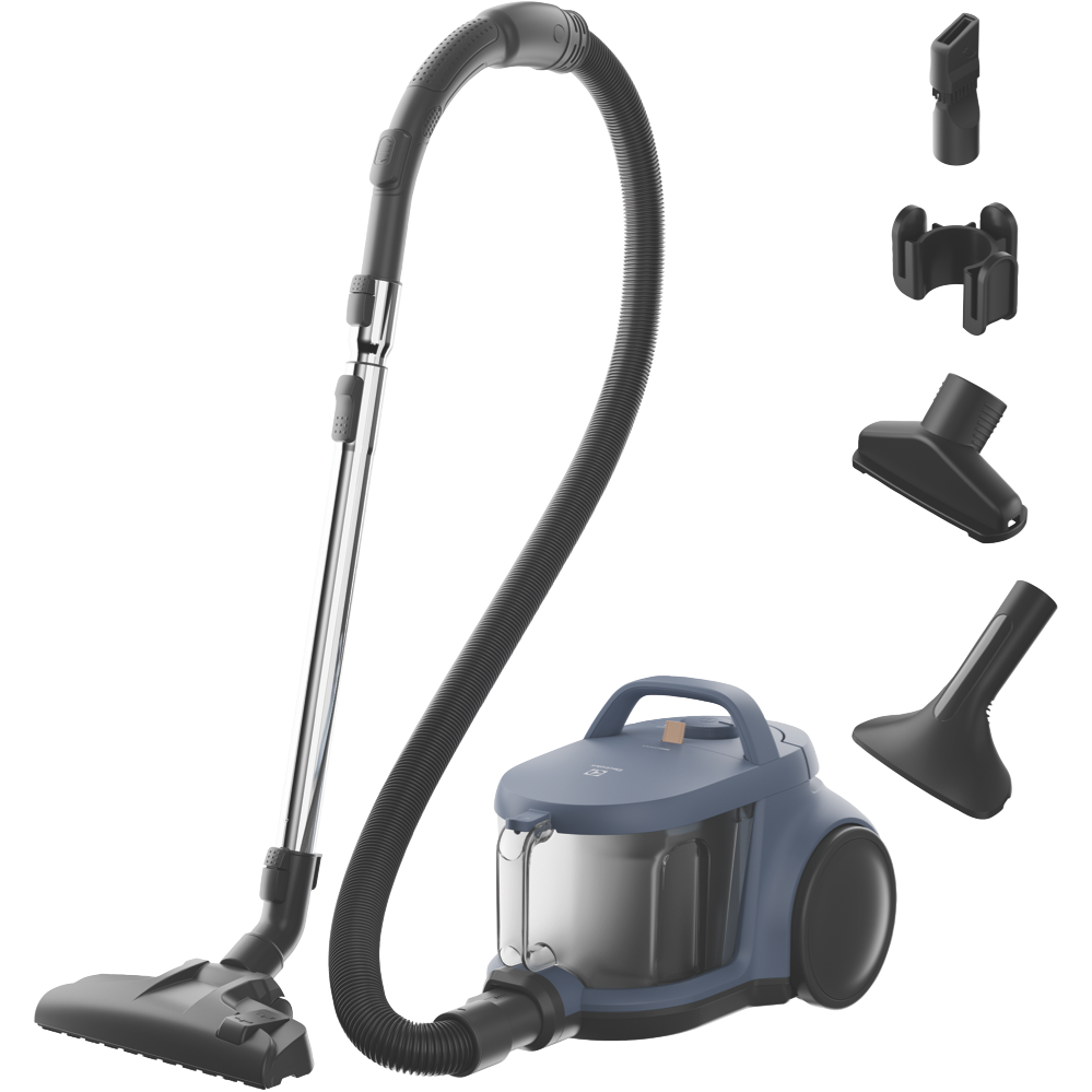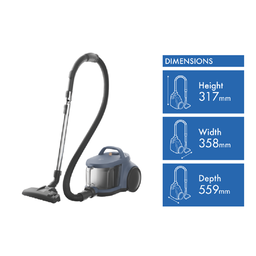 Keep your home spotless with this 500 Series Barrel Vacuum in stylish Denim Blue. Designed for all floors and upholstery it's especially effective for pet owners capturing up to 98.9% of microdust particles larger than 1.0 microns. The bagless design features a generous 2L bin capacity so you can clean longer without interruptions. Running on standard 220-240V power with an 86 decibel output this vacuum provides thorough cleaning performance across your home. Comes with a 1 Year Manufacturer's Warranty. Model EFC52513DB.