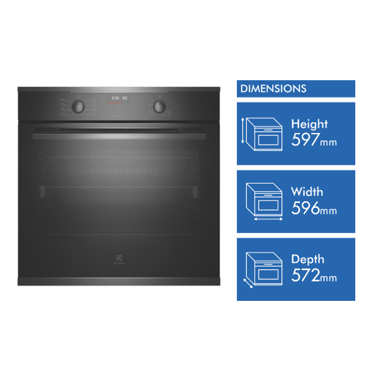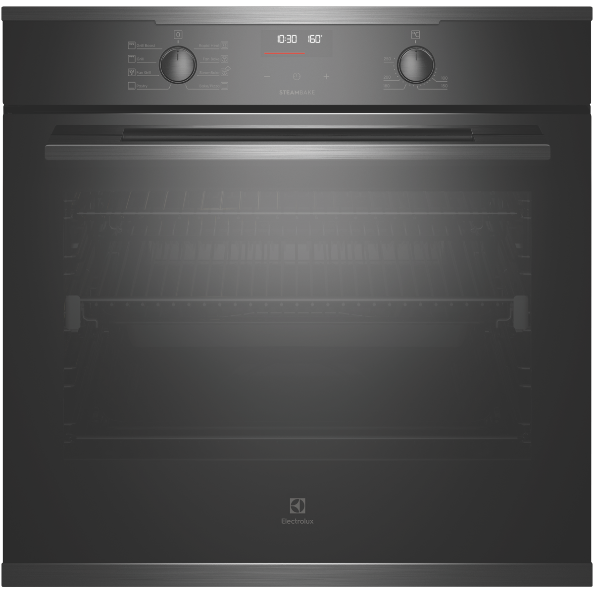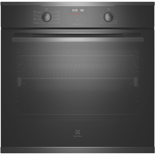 Create tasty dishes using one of eight cooking functions with the stunning Electrolux 60cm Multifunction Oven EVE614DSE in dark stainless. For crispy breads with a moist centre allow the combination of hot air and steam in the SteamBake setting to perfect bakery-style breads from home or bring frozen pre-cooked foods to the right temperature fast with the Rapid Heat function for enjoying a homemade meal or frozen packaged favourites straight out of the freezer. It has a 72-litre usable oven capacity. This Electrolux oven comes with a set of easy-glide fully extendable telescopic runners to easily and safely check up on your dinner creations while a triple-glazed oven door ensures the outside remains cool to touch. Plus the oven door frame can be easily removed and the glass panels detached from the frame to achieve a through clean. With a dark stainless-steel finish and premium-look aesthetics this electric oven integrates effortlessly into any modern kitchen.