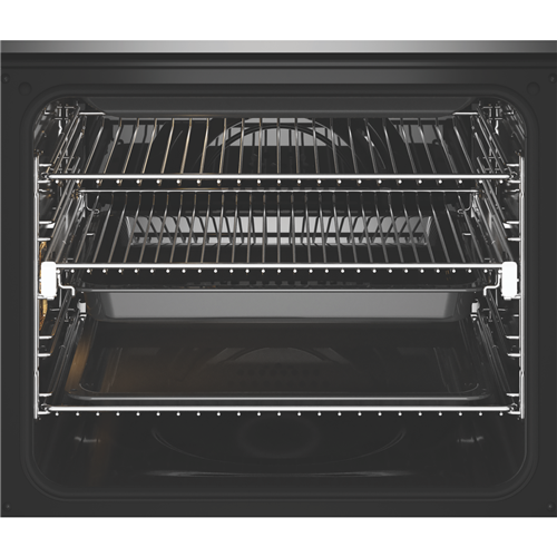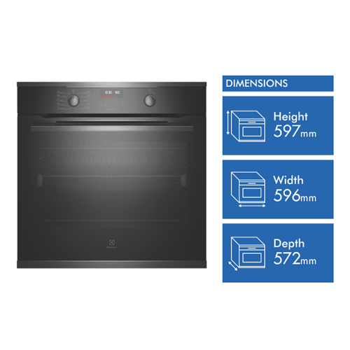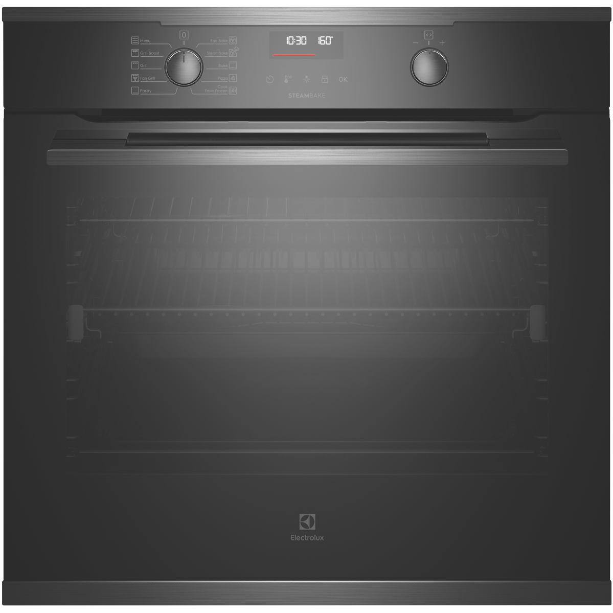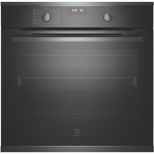 Create tasty dishes with effortless clean up with this stunning Electrolux 60cm Pyrolytic Oven EVEP614DSE in dark stainless steel. For crispy breads with a moist centre allow the combination of hot air and steam in the SteamBake setting to perfect bakery-style breads from home or bring frozen pre-cooked foods to the right temperature fast with the Cook from Frozen function for enjoying a homemade meal or frozen packaged favourites straight out of the freezer. It has a 72-litre usable oven capacity. This Electrolux oven comes with a set of easy-glide fully extendable telescopic runners to easily and safely check up on your dinner creations while a quadruple-glazed oven door ensures the outside to reduce the outside temperature of the door when the pyrolytic self-cleaning function is in play. Plus the oven door frame can be easily removed and the glass panels detached from the frame to achieve a through clean. With a dark stainless steel finish and premium-look aesthetics this electric oven integrates effortlessly into any modern kitchen.