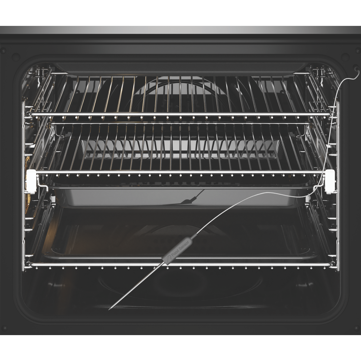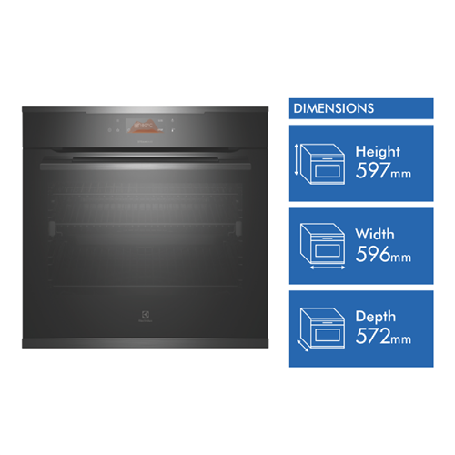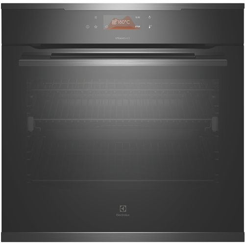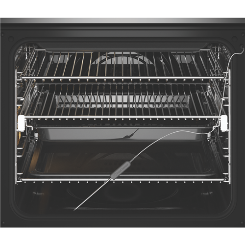 Take the guesswork out of cooking and the elbow grease out of cleaning with the stunning Electrolux 60cm Pyrolytic Oven EVEP615DSE in dark stainless steel. For tasty and succulent results the included smart food probe with sensor not only monitors the core temperature of roasts it'll even let you know when the desired temperature has been reached and will automatically stop cooking to prevent foods from drying out. Use the smart sensor food probe in conjunction with one of the cooking functions like Fan Cooking Traditional Bake Fan Assist Bake or Roast. Some functions are auto programs where the cooking function time and temperature are auto adjusted to deliver the best results when you either input the food weight or insert the food probe. To perfect bakery-style breads from home allow the combination of hot air and steam in the SteamBake setting to create crispy breads with a moist centre. This Electrolux oven comes with a set of easy-glide fully extendable telescopic runners to easily and safely check up on your dinner creations and a SoftMove door which can maintain an angled open position if needed and will close softly with a gentle push. For an easy clean select the Steam Assisted Cleaning function to loosen up food residue. With a dark stainless-steel finish and premium-look aesthetics this electric oven integrates effortlessly into any modern kitchen.