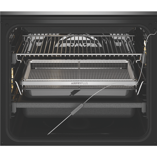 Create tasty meals via a variety of cooking functions including air frying steam cooking bake grill and more and enjoy effortless clean up afterwards with the Electrolux 60cm Pyrolytic Steam Oven EVEP619DSE in dark stainless steel. For succulent results the included smart food probe with sensor not only monitors the core temperature of roasts it'll even let you know when the desired temperature has been reached and will automatically stop cooking to prevent foods from drying out. Use the smart sensor food probe in conjunction with one of the cooking functions like Fan Cooking Traditional Bake Fan Assist Bake or Roast. This Electrolux oven comes with pyrolytic-proof side racks and double action telescopic runners so for easy cleaning these do not need to be removed when the self-cleaning pyrolytic function is in play - simply remove the trays and shelves.