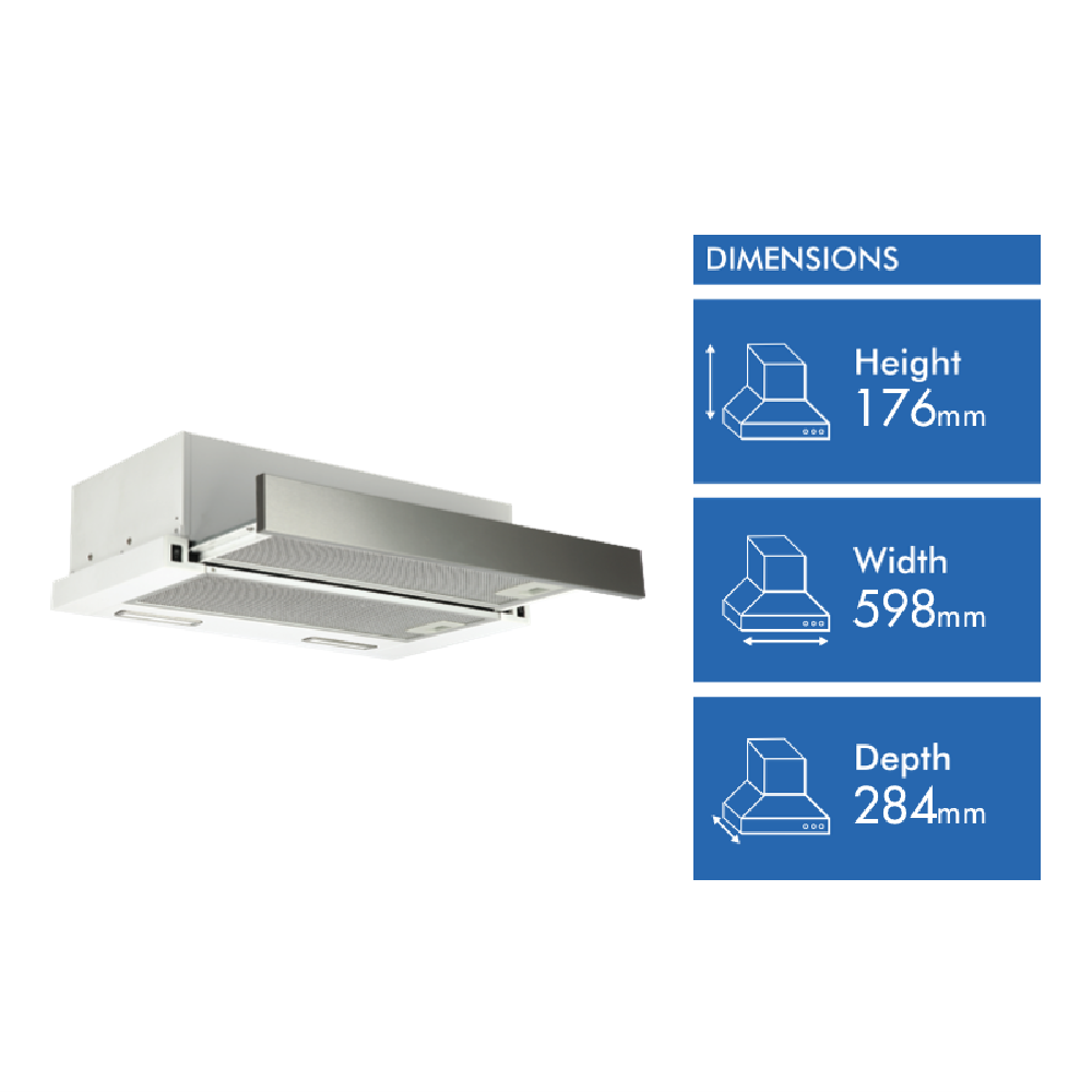 Bring sleek style and powerful performance to your kitchen with the Emilia 60cm Slideout Rangehood. This stainless steel hood makes a striking focal point above any cooktop or stove with its modern lines and polished finish. But it's more than just good looks - the Emilia rangehood is engineered to keep your kitchen breezy and fresh. Two energy-efficient LED lights illuminate your cooking surface while twin motors quietly and powerfully extract up to 320 cubic meters of air per hour. The two-speed fan and slide controls let you adjust airflow to suit the intensity of cooking. This ducted model vents outside helping remove steam grease odors and more from the kitchen air. The two mesh filters trap grease and are simple to remove and clean. This keeps the interior of the hood clean and operating at peak performance. At just 43 to 55 decibels the Emilia rangehood works hard without making excessive noise. With a width of 598mm height of 176mm and depth of 284mm the Emilia rangehood makes an imposing and ultra-modern statement in your kitchen. It comes with a two year manufacturer's warranty for peace of mind. The manufacturer's part number for this product is CK60SLF. Bring fresh air and style to your cooking space with the Emilia 60cm Slideout Rangehood today.
